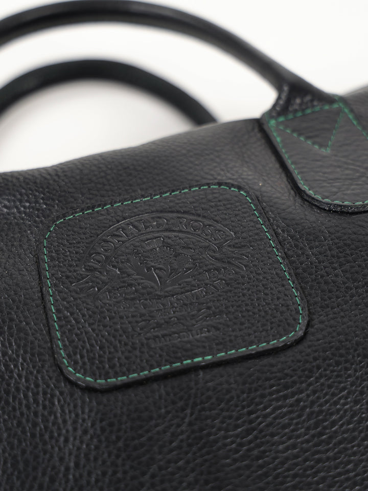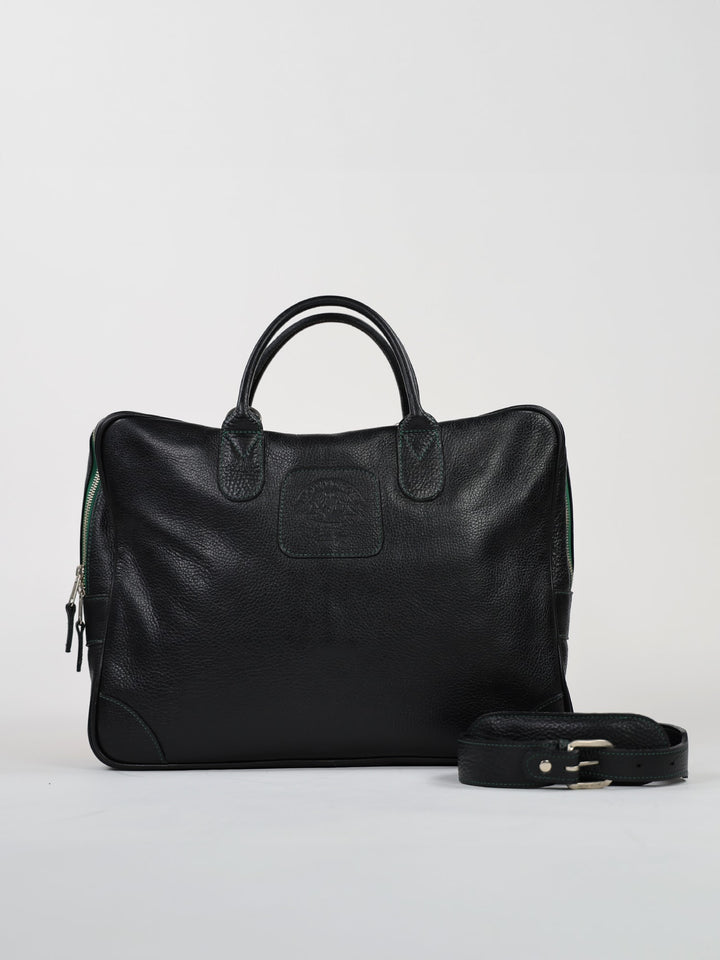 Take Donald Ross' limited edition Black Leather Briefcase on your daily commute. This bag features a a black leather outside and Kelly green accents. Constructed from genuine full grain black leather with plaid lining.