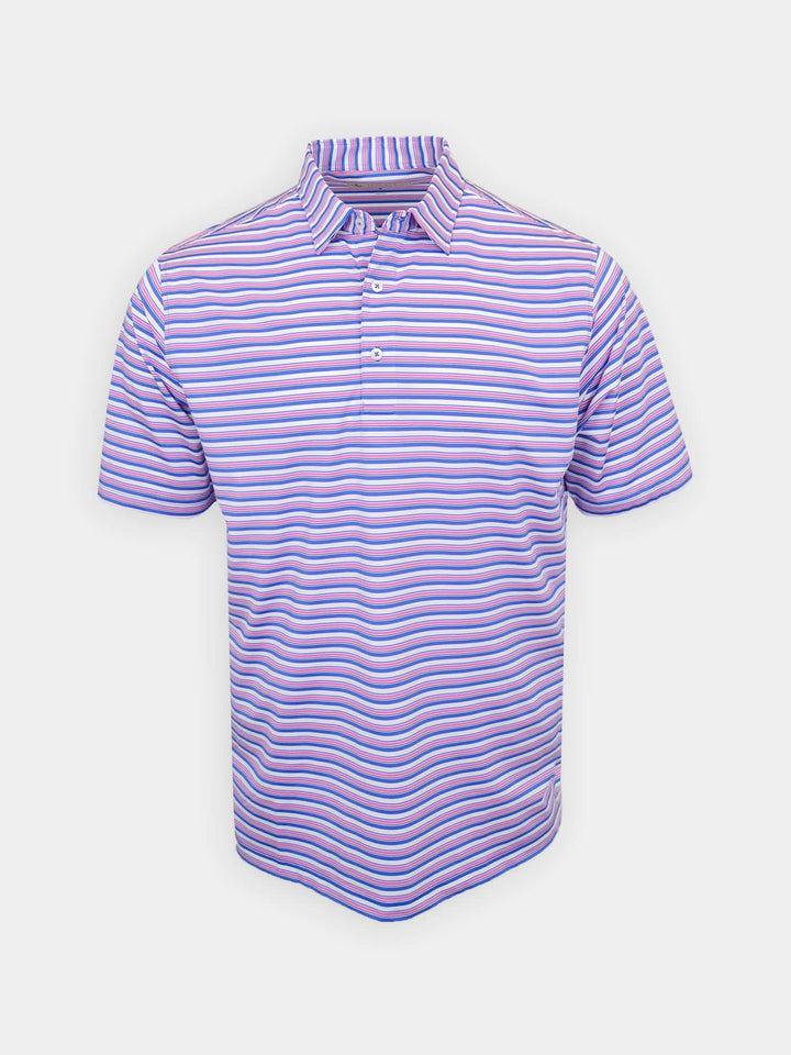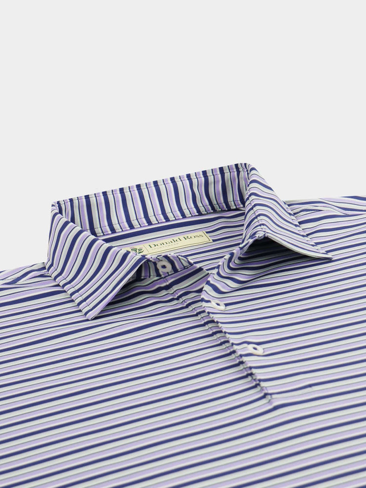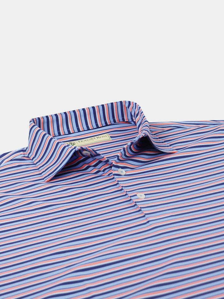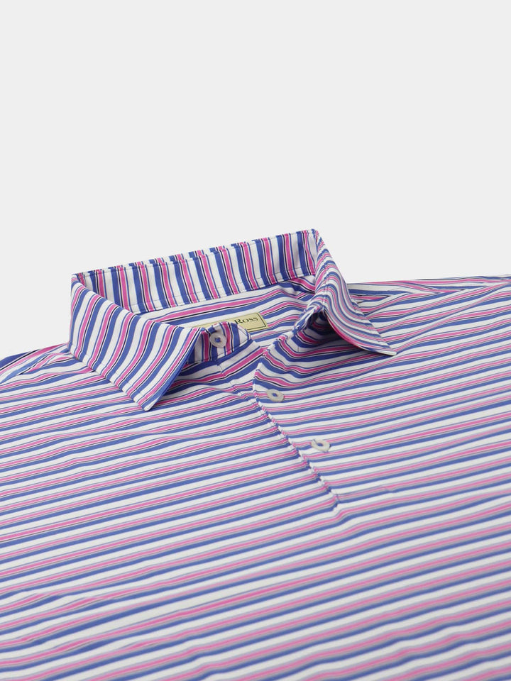 The Men's Bold Multi Stripe Polo by Donald Ross Sportswear. An eye catching stripe featuring a classic and multi-colored stripe. Constructed from our best selling technical performance fabric, this garment feels cool to the touch and wicks moisture away from your body. Offers full stretch and breathability for endless comfort on and off the course.