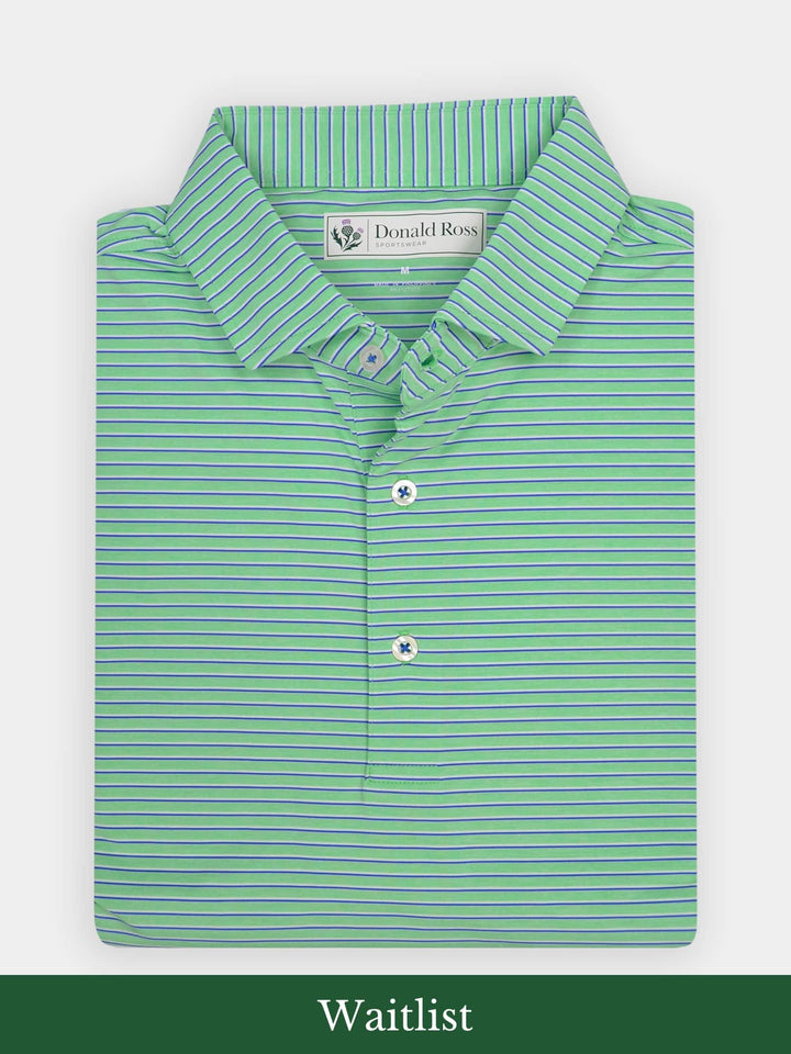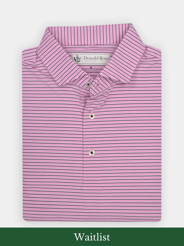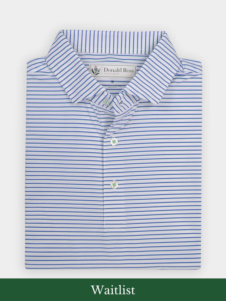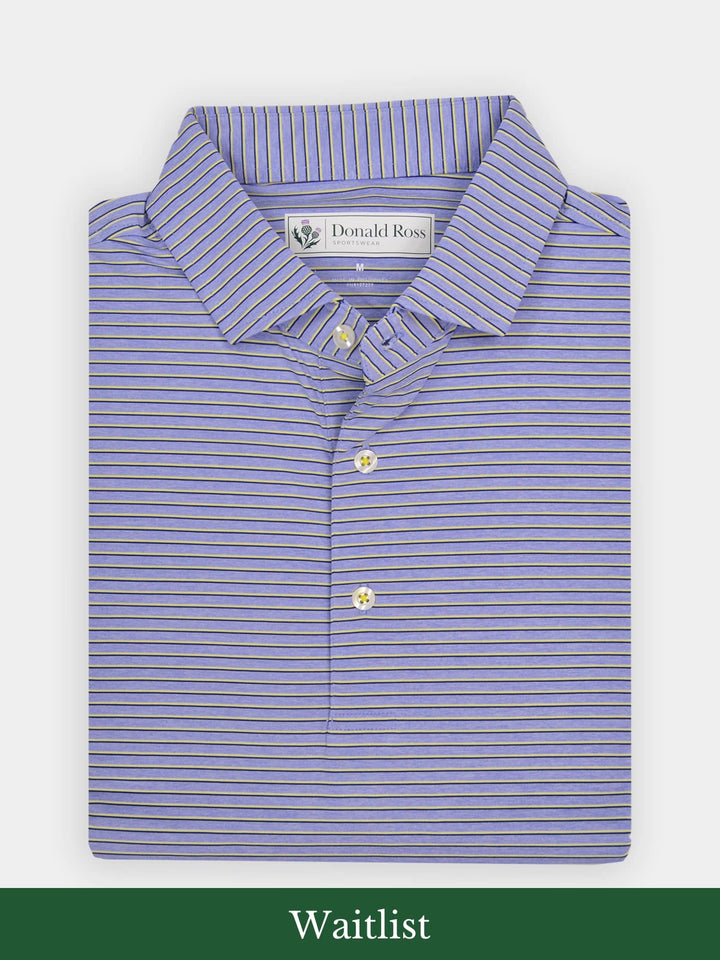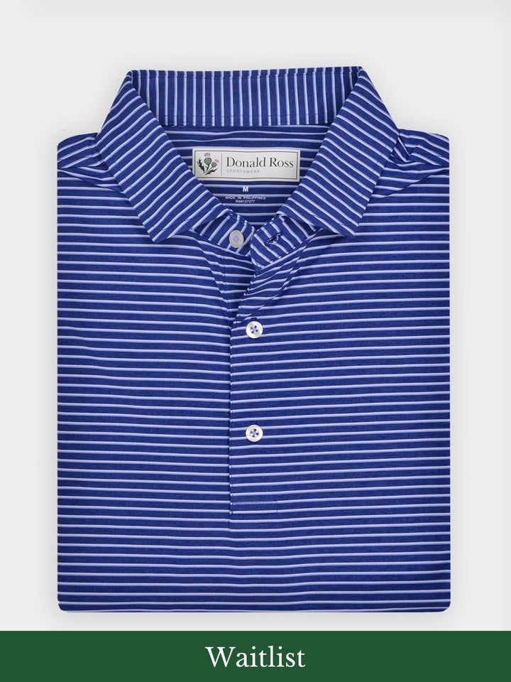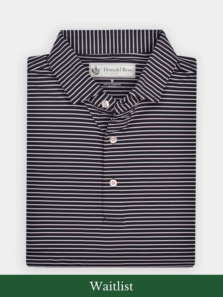 The Nantucket Classic Fit Stripe Polo by Donald Ross Sportswear. Crafted with our signature performance fabric, it ensures comfort, wicks moisture, and offers UPF50 sun protection.