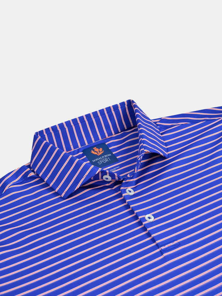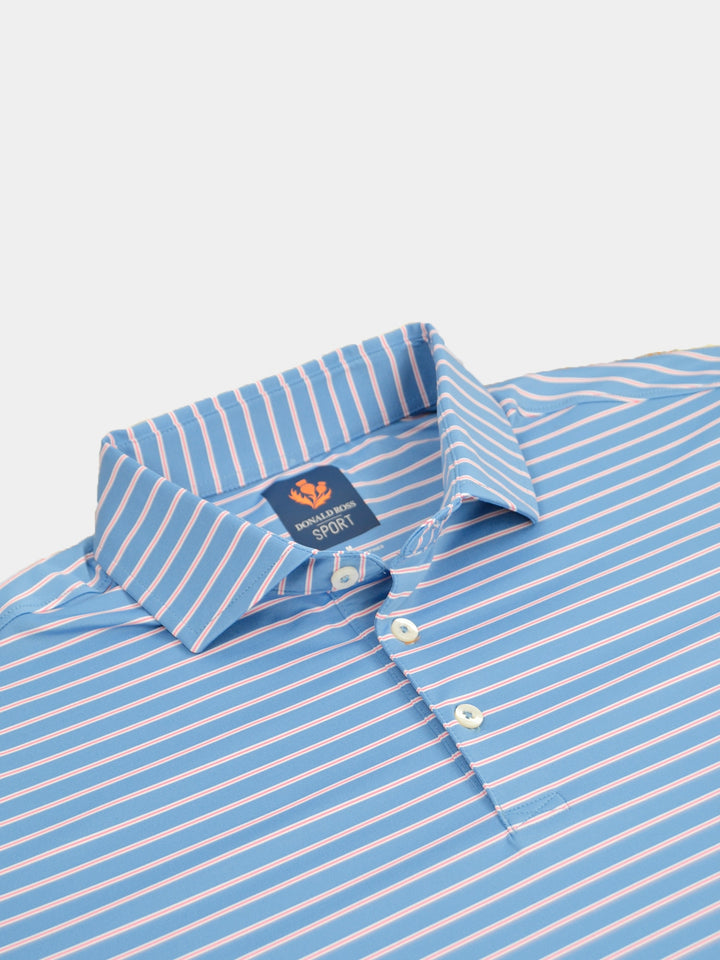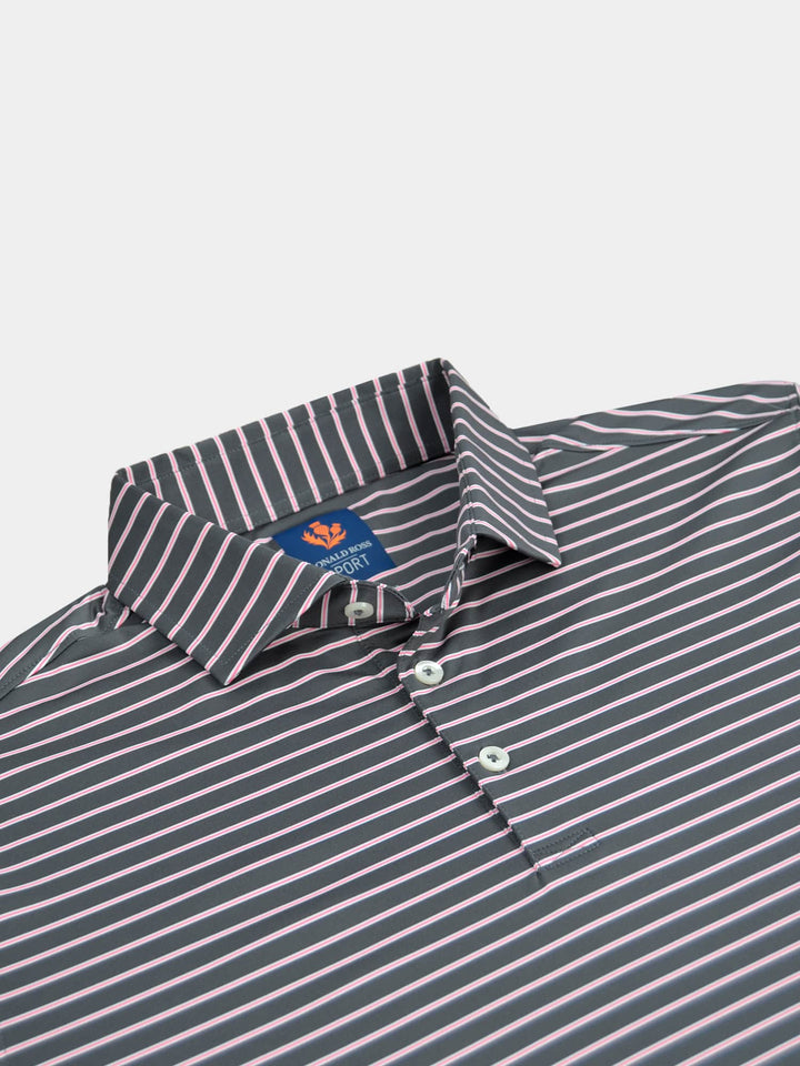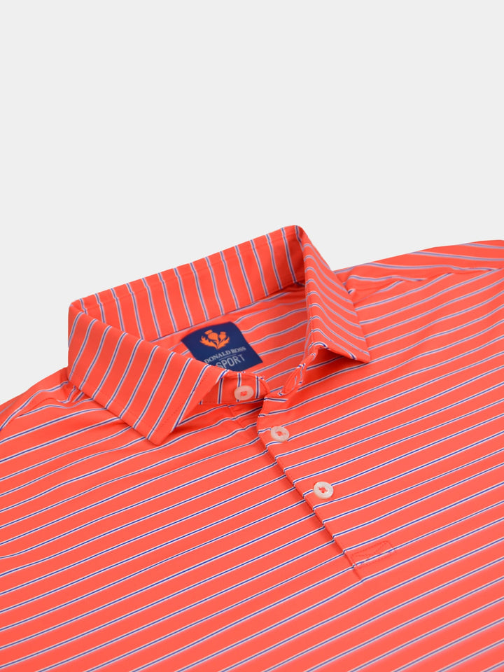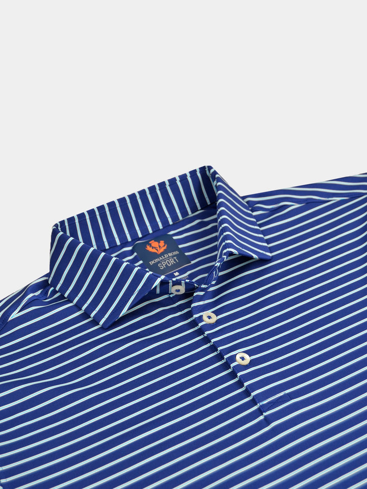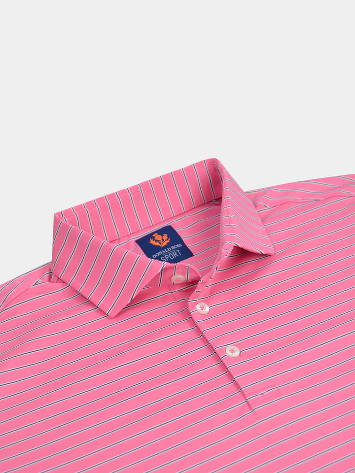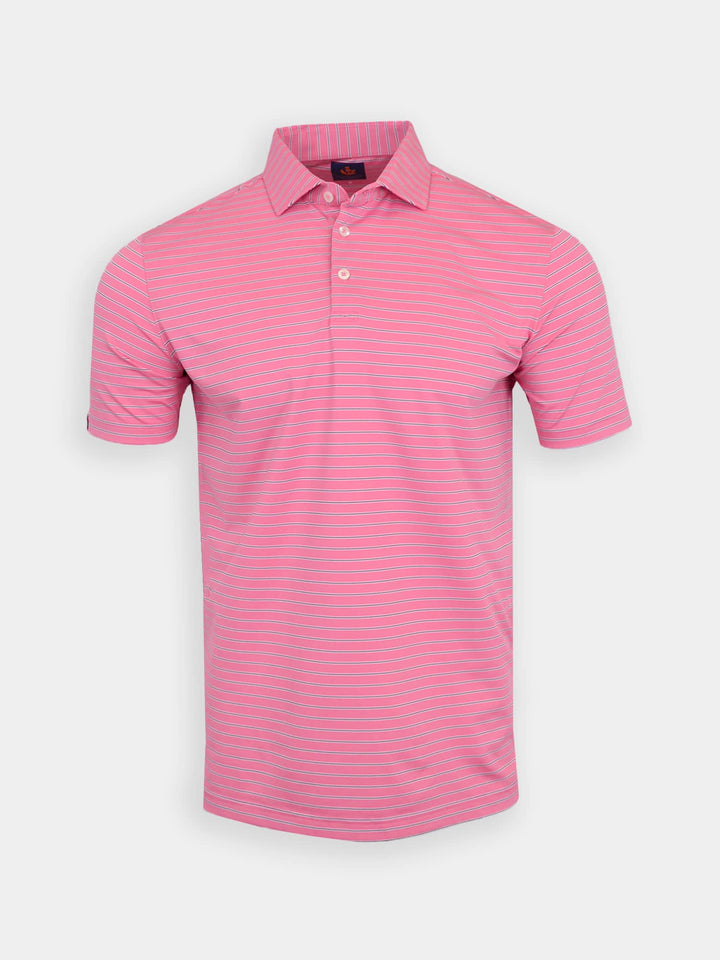 The Ian, Men's Multi Mini Stripe Polo by Donald Ross Sportswear. A timeless polo offered in six flattering color ways that add a subtle pop of color to any outfit. Constructed from our performance jersey fabric, this garment feels cool to the touch and stays dry with moisture-wicking fabric. The Ian offers full stretch and breathability for endless comfort on and off the course.
