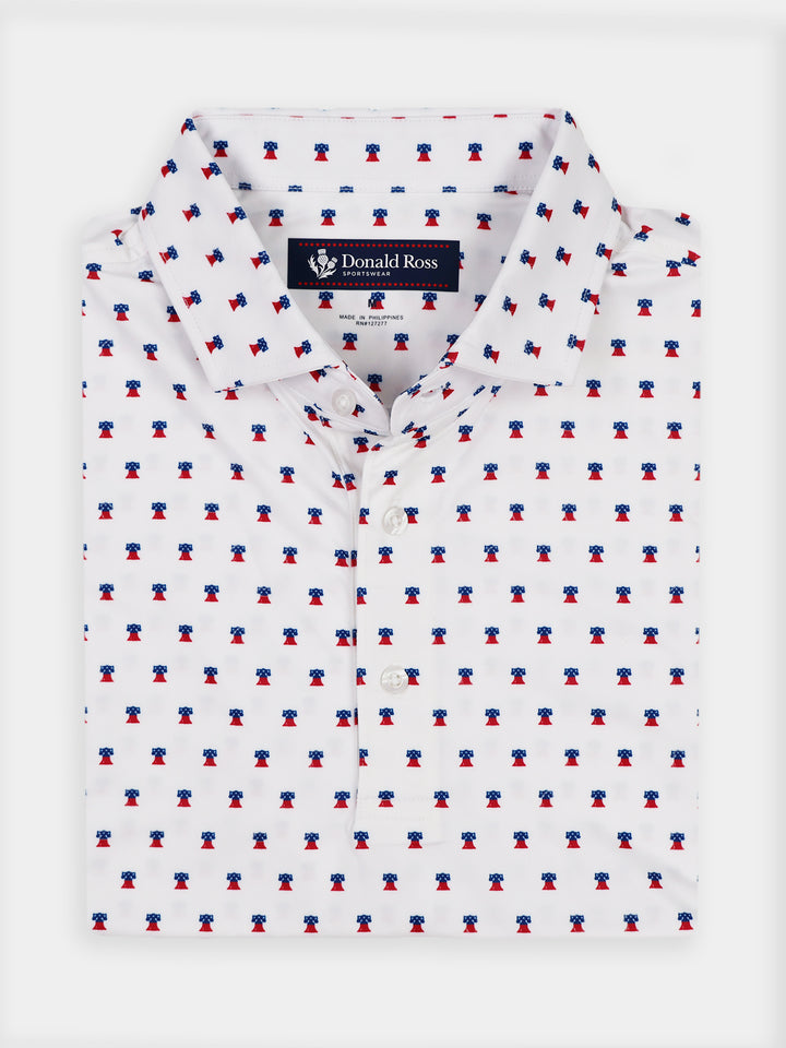The Jacksonville by Donald Ross Sportswear is a liberty bell print print jersey performance polo. This polo is available in one color.