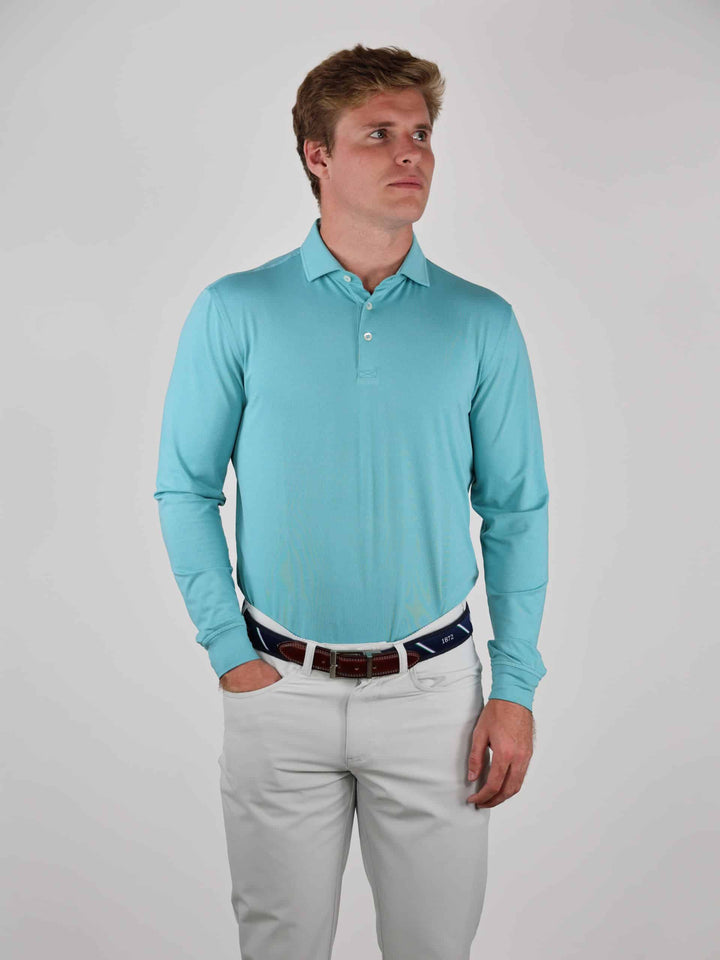 Constructed from a melange i-peach jersey that offers four-way stretch, the Mac offers breathable warmth and easy-care properties. Our melange performance long sleeve is a great golf shirt option for overall style and comfort. Model features a classic three-button placket, spread collar, and ribbed cuffs. Designed for performance, the Mac is a great addition to any golfer’s wardrobe and lifestyle.