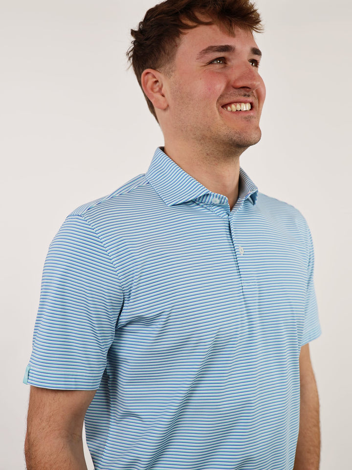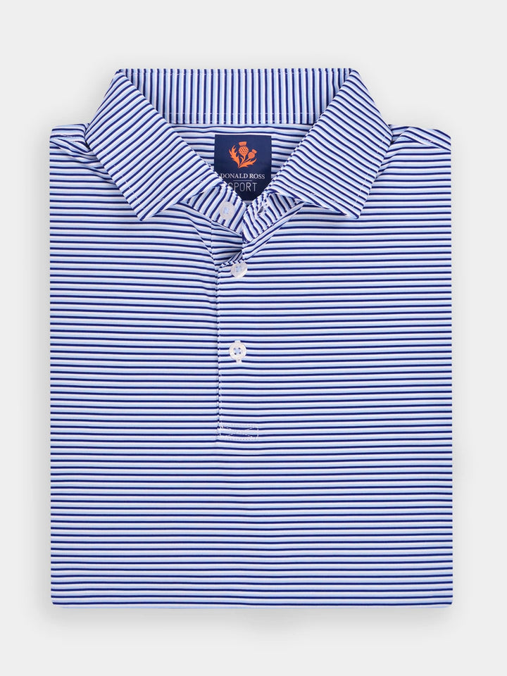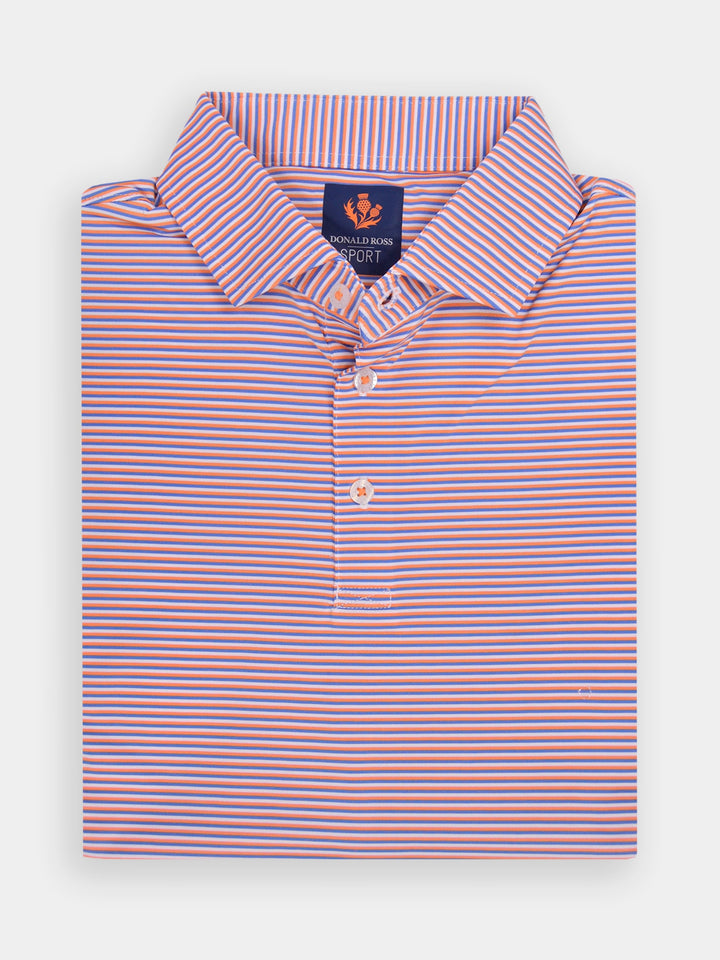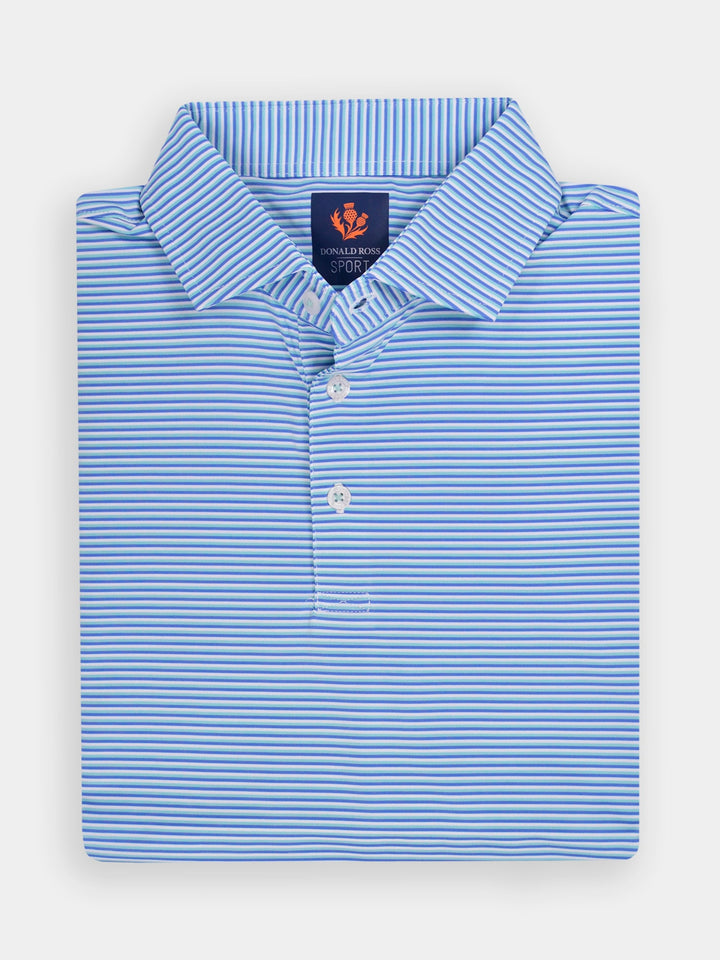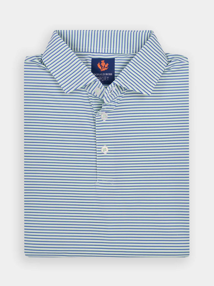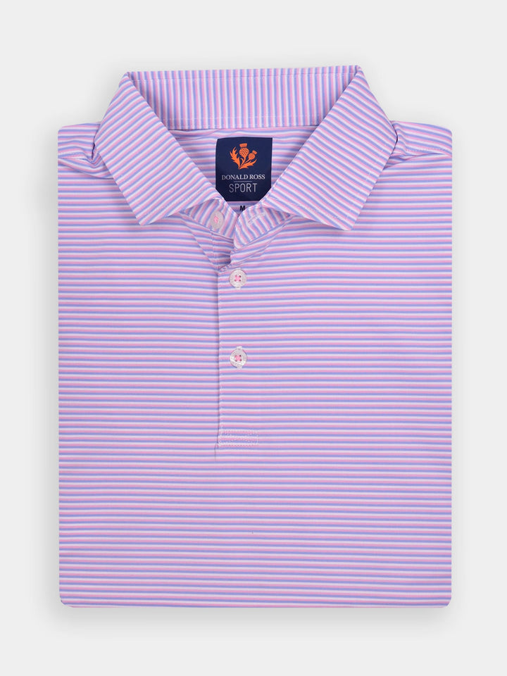 The Jesse, Men's Multi Stripe Polo by Donald Ross Sportswear. The Jesse features a timeless three-color pin stripe polo offered in six color ways. Constructed from our performance jersey fabric, this garment feels cool to the touch and remains dry with moisture-wicking fabric. The Jesse offers full stretch and breathability for overall comfort on and off the course.