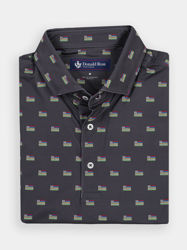 This performance print polo combines functionality and tribute in one great design. It’s a must-have addition to any golfer’s wardrobe, offering comfort, protection, and a touch of patriotism.