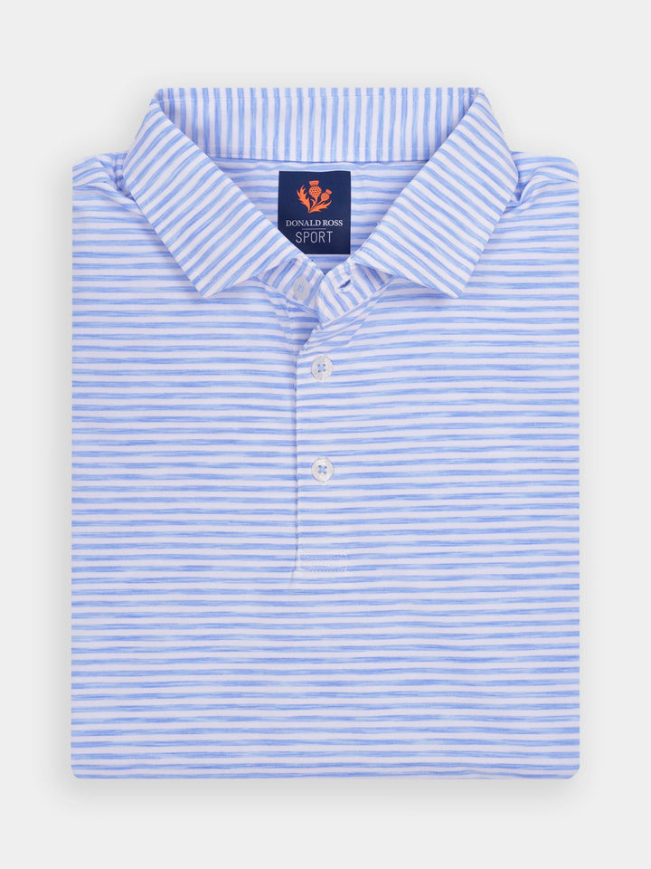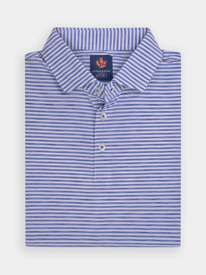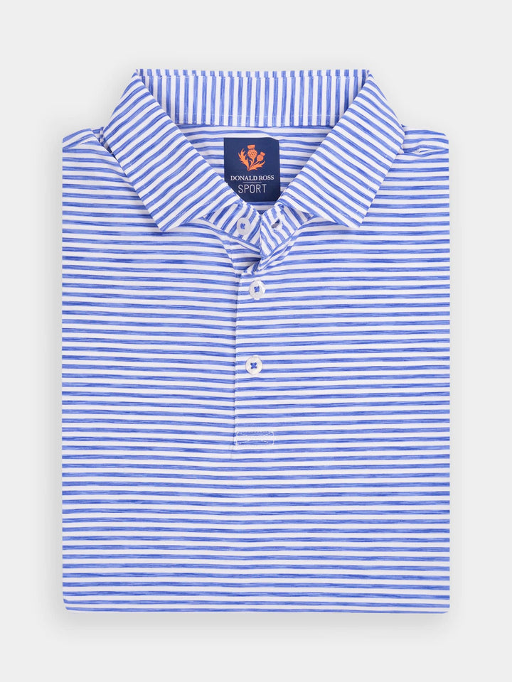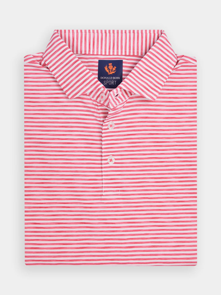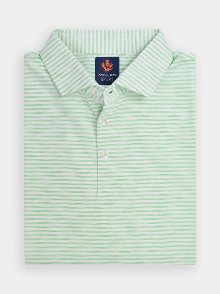 The Owen, Men's Space Dye Feeder Stripe Polo by Donald Ross Sportswear. The Owen features a feeder stripe polo offered in seven vivid color ways. Constructed from our performance jersey fabric, this garment feels cool to the touch and also keeps dry with moisture-wicking fabric. The Owen offers full stretch and breathability for overall comfort on and off the course.