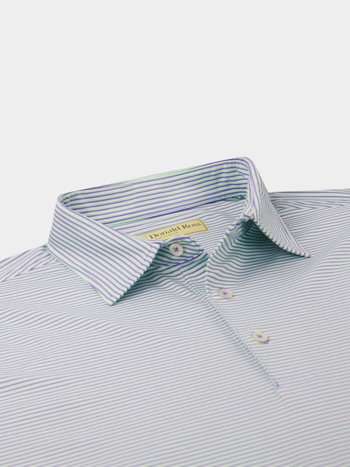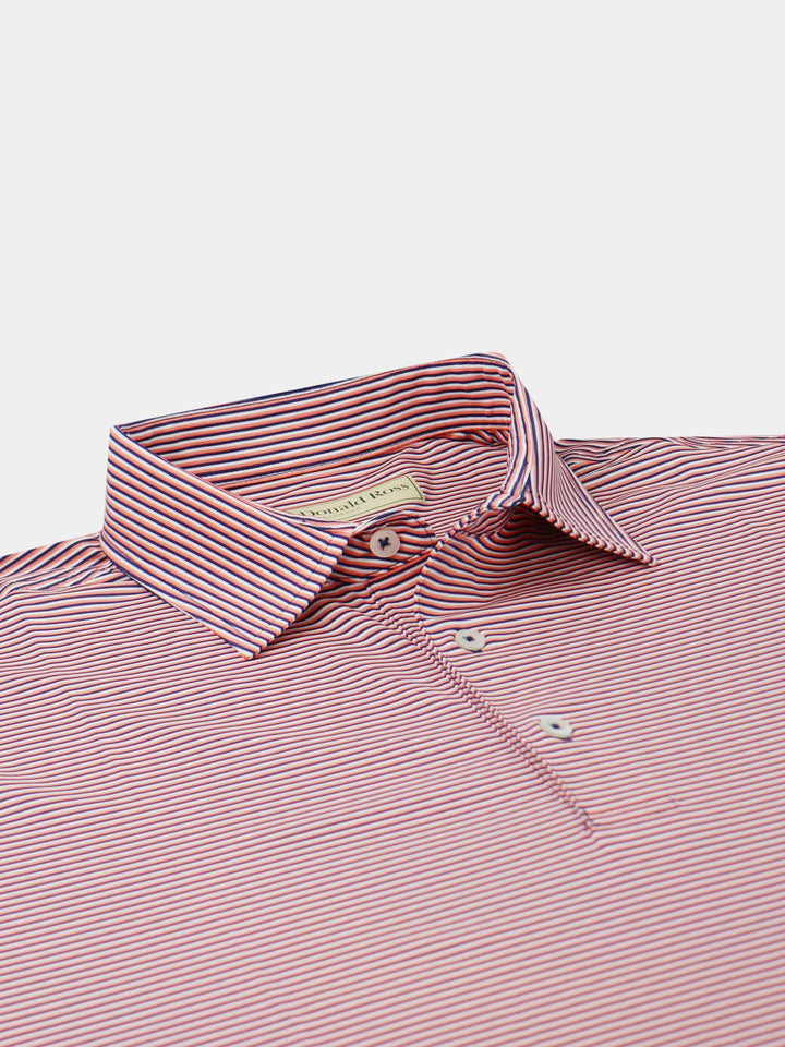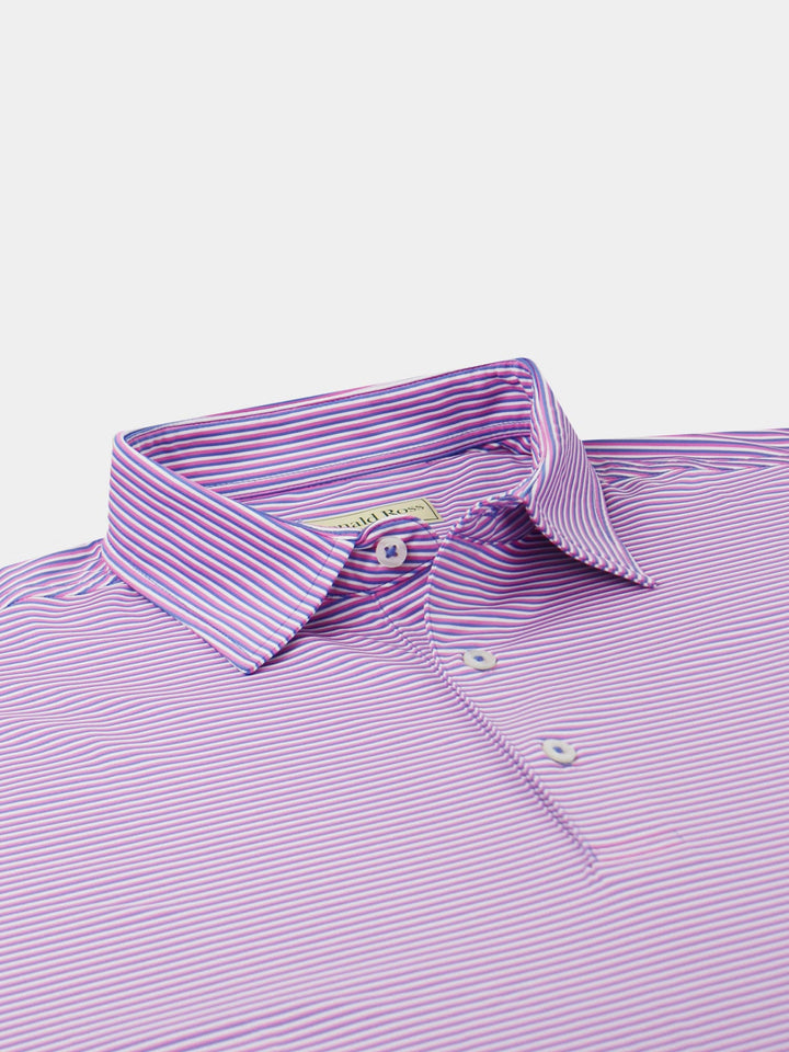 The Three Color Stripe Polo Classic Fit Men's Golf Polo by Donald Ross Sportswear. A timeless golf polo featuring our staple multi stripe in four colorways. Constructed from our best selling technical performance jersey, this garment feels cool to the touch and wicks moisture away from your body. The Multi Stripe Classic Fit Men's Golf Polo offers full-stretch and breathability for endless comfort on and off the course.