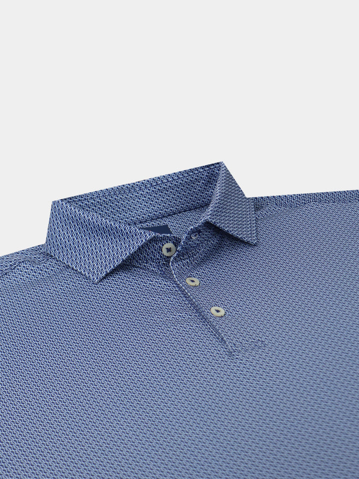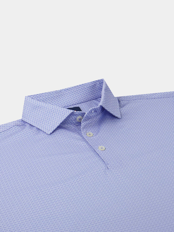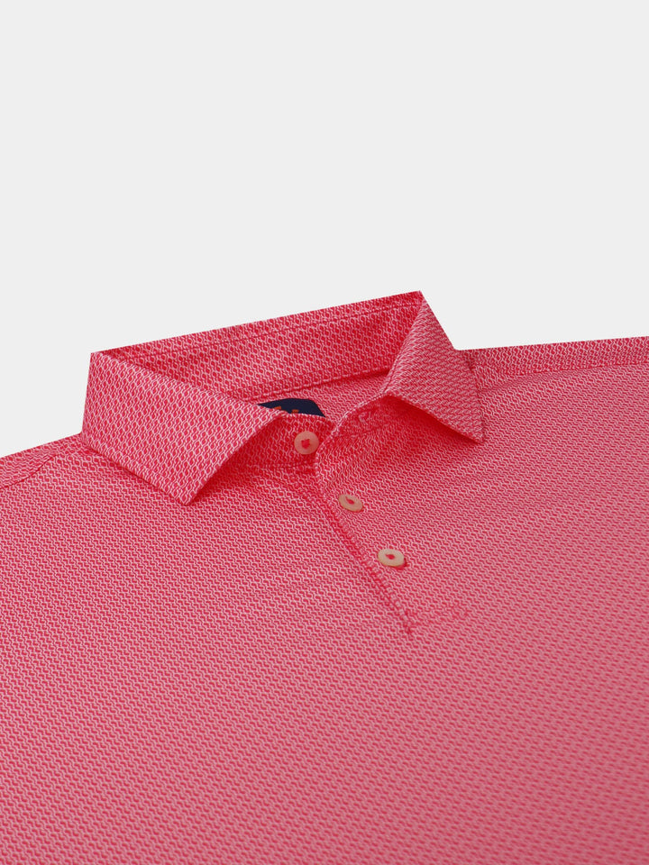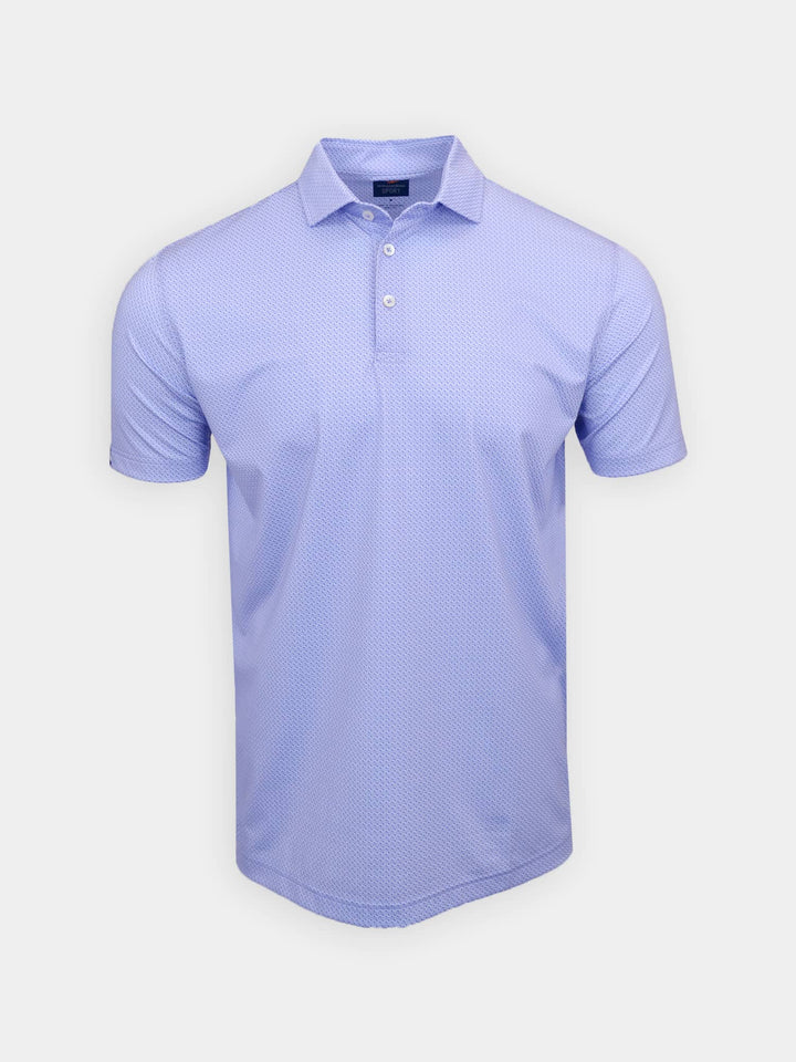 The Duncan, Men's Wishbone Print Polo by Donald Ross Sportswear. A unique and subtle wishbone print in four unique colorways. Constructed from our best selling technical performance jersey, this garment feels cool to the touch and stays dry as it wicks moisture away from your body. The Duncan offers full stretch and breathability for endless comfort on and off the course.