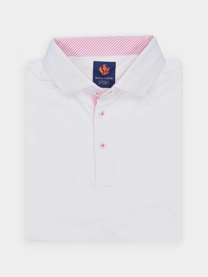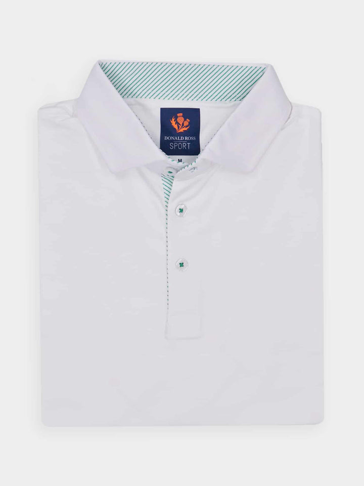 The Donny, Striped Placket Golf Polo by Donald Ross Sportswear. The Donny features a fancy striped placket interior in six lively color combinations. Constructed from our performance jersey fabric, this garment feels cool to the touch and also keeps dry with moisture-wicking fabric. The Donny offers full stretch and breathability for overall comfort on and off the course.