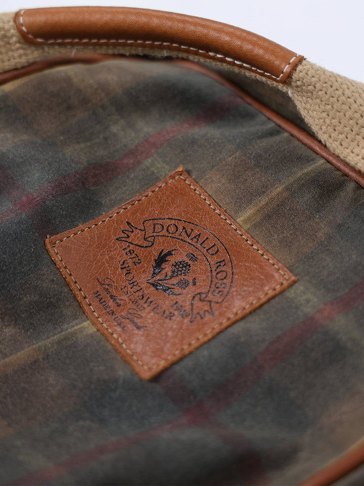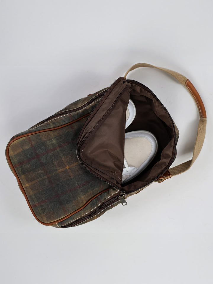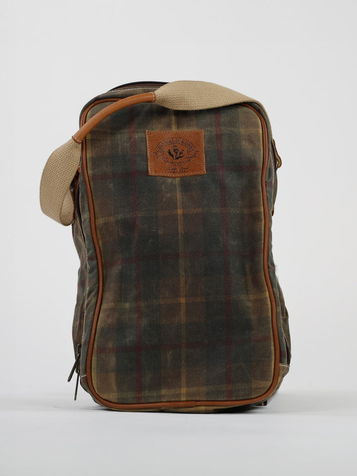 Keep your shoes neatly stowed in Donald Ross' limited edition Subtle Plaid Shoe Bag. This bag features a subtle plaid pattern in waxed canvas fabric with brown leather accents. The durable waxed canvas and stylish fabric pattern make this a one of a kind accessory to and from the course. This bad is one of one along with the coordinating duffel.
