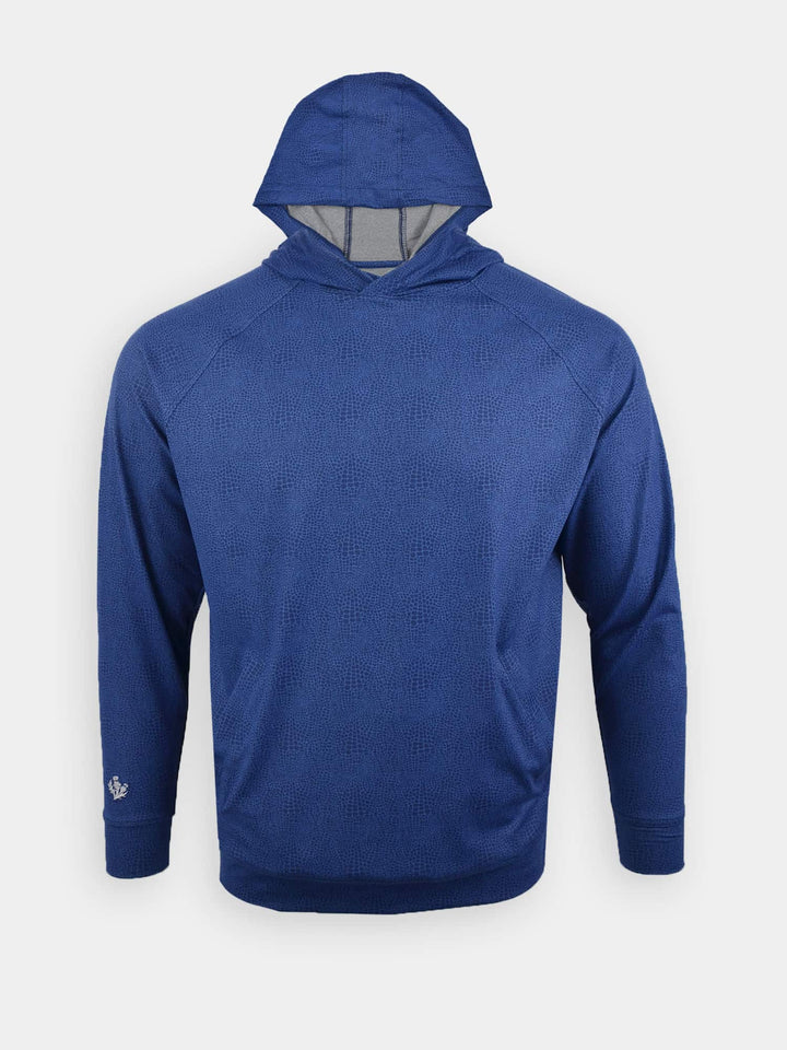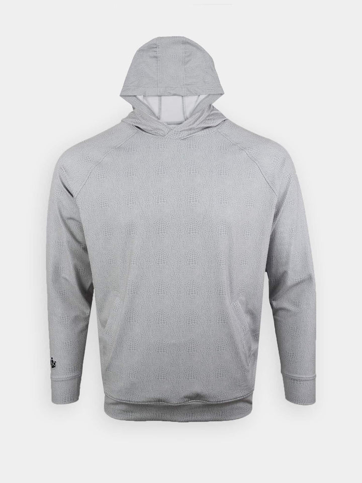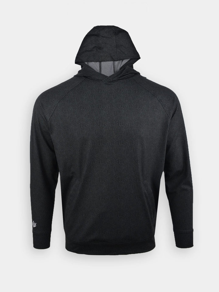 The Men's Printed Golf Hoodie by Donald Ross. A golf hoodie combines a modern performance fabric and model. The Tyler delivers a raglan sleeve and four way stretch with an alligator spring print. In 3 core colors of Navy, Black and Quarry, the Men's Printed Golf Hoodie is a wardrobe staple this spring.