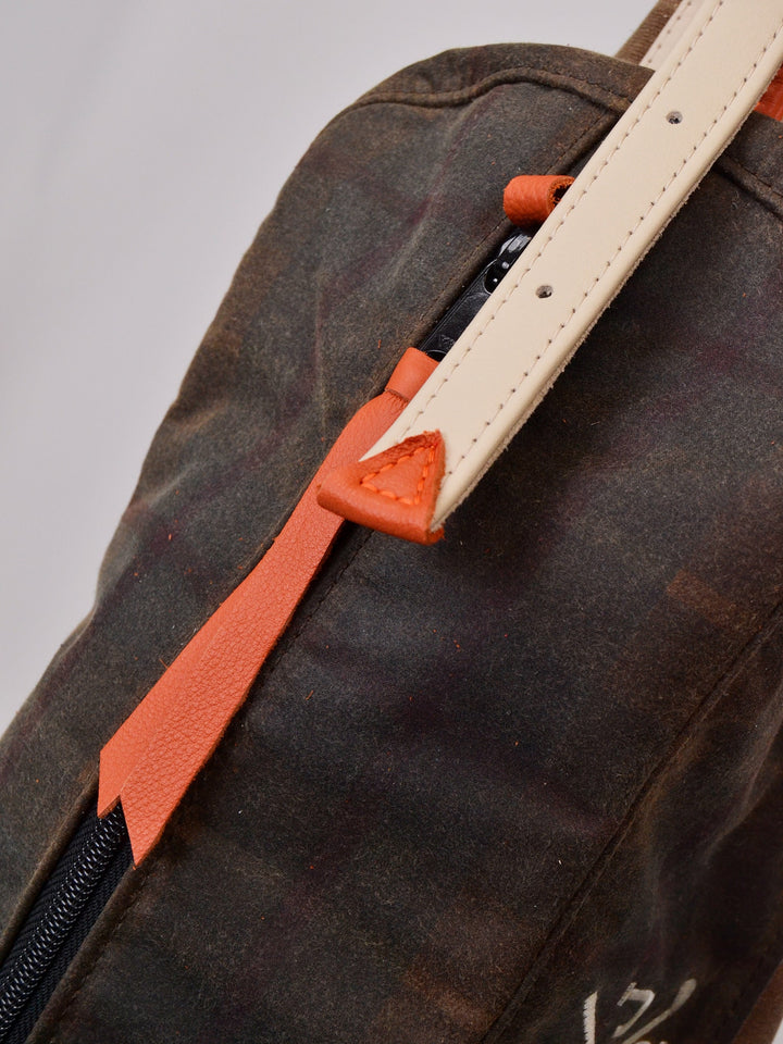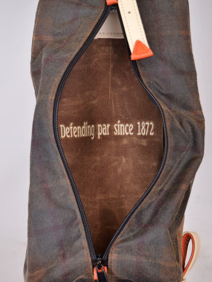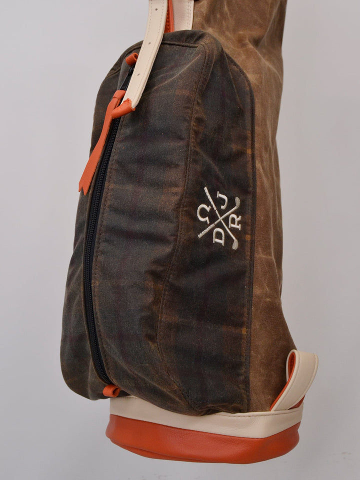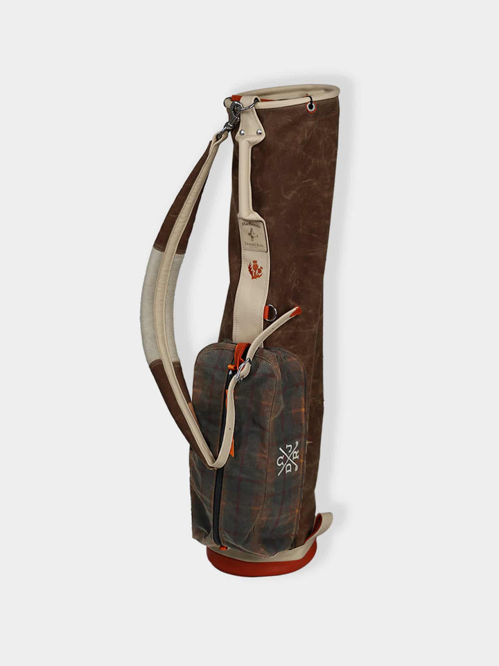 Designed in collaboration with MacKenzie Golf Bags and made by hand in the USA from the highest quality waxed canvas. This custom golf bag is waterproof to the elements, lightweight, and has a 8" opening - enough to fit 14 clubs. The single strap and detailing are craft from beautiful full-grain leather. The pocket includes a subtle plaid pattern in waxed canvas fabric and our brand slogan embroidered inside.