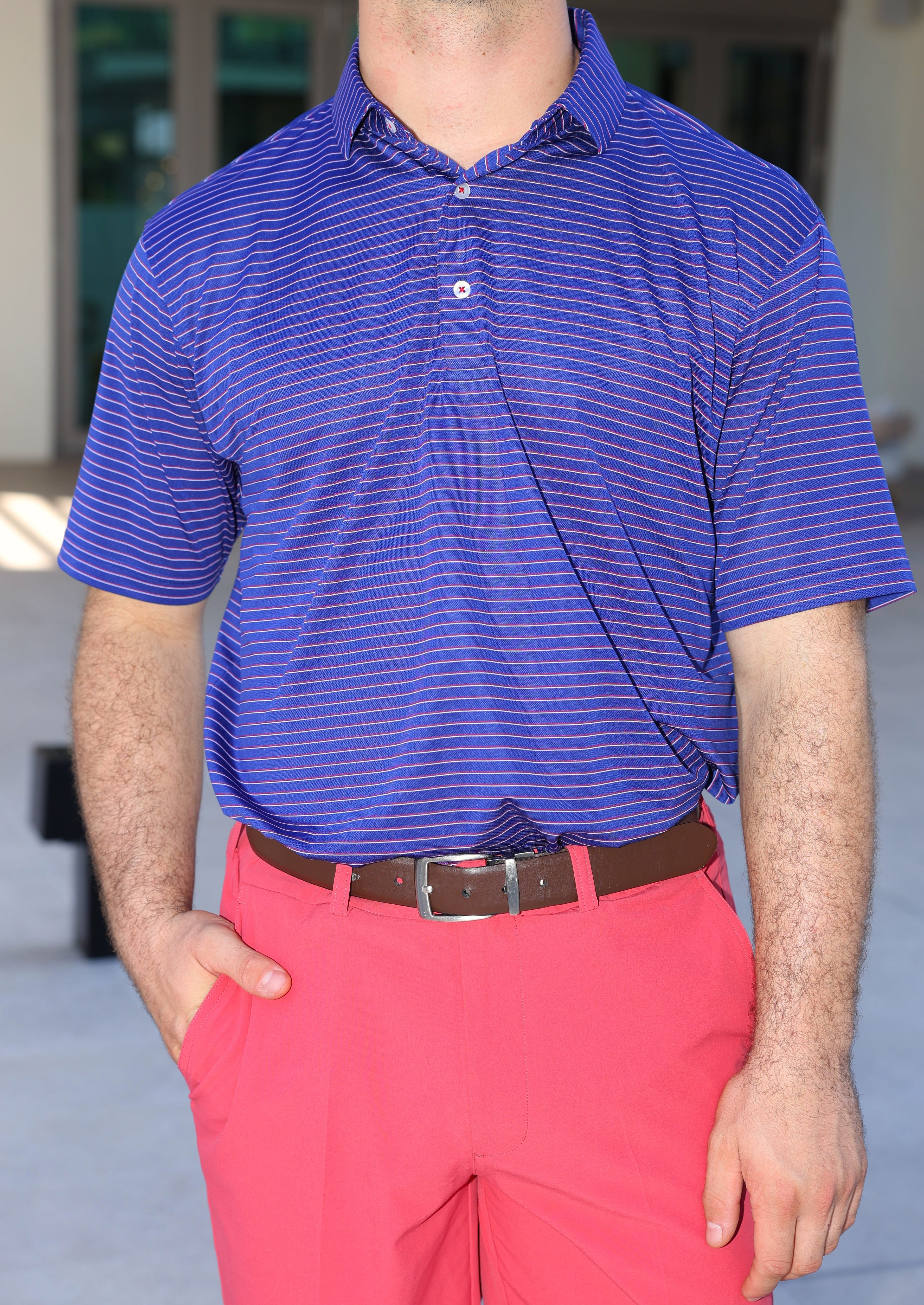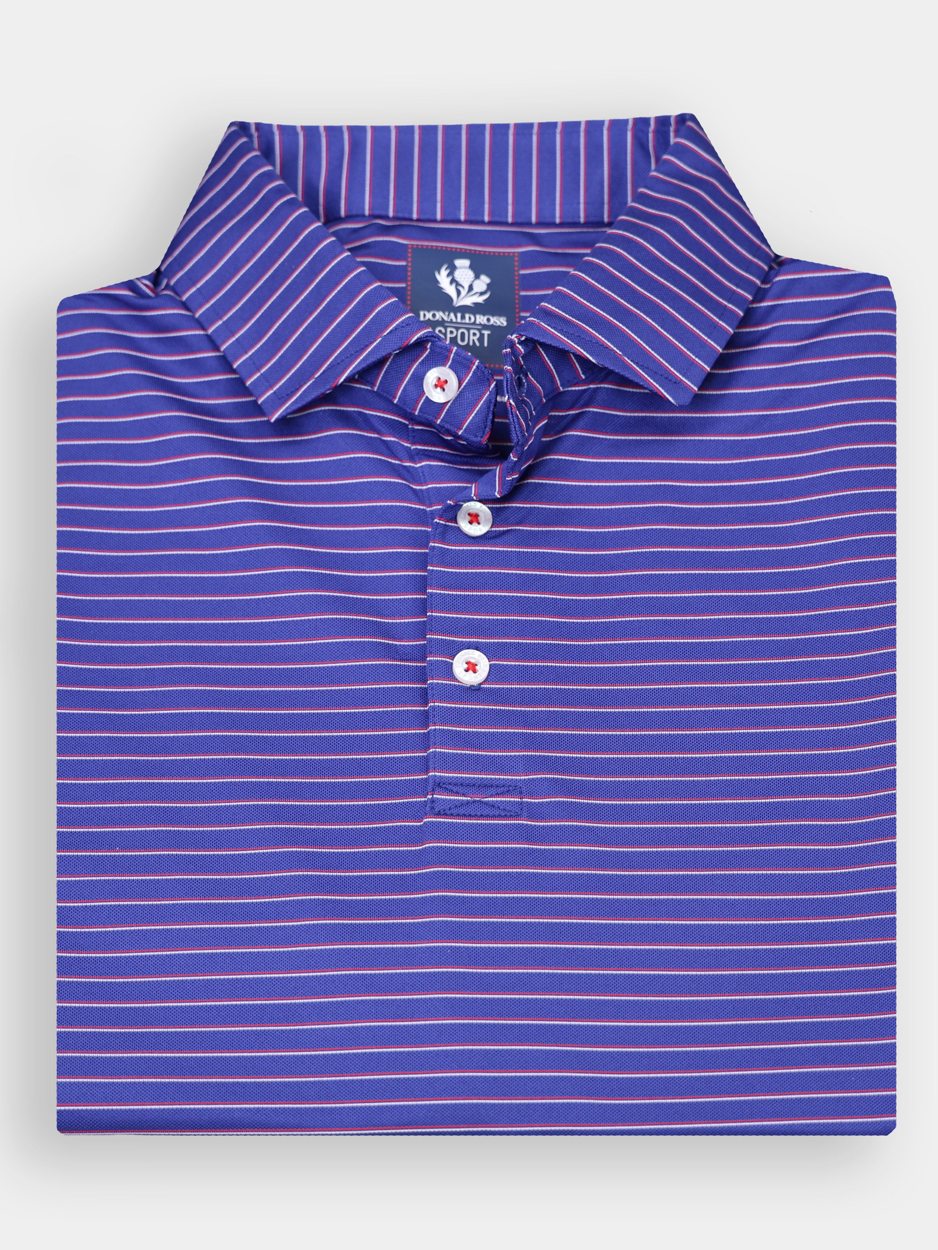 The Bryson Striped Patriotic Polo by Donald Ross Sportswear stands out with its bold design. Made from a hybrid baby pique / jersey fabric, this polo keeps you cool and dry with its moisture-wicking properties.