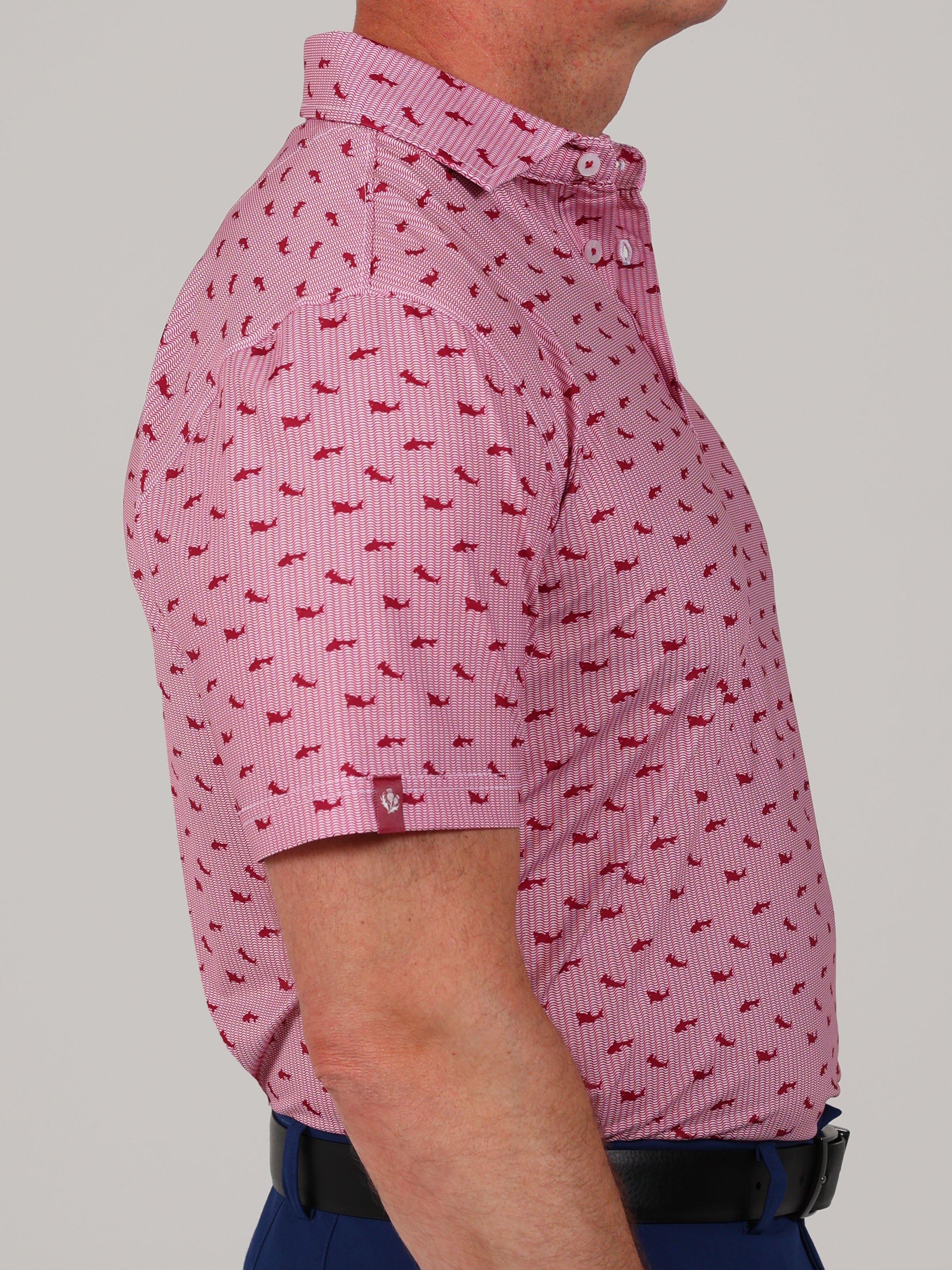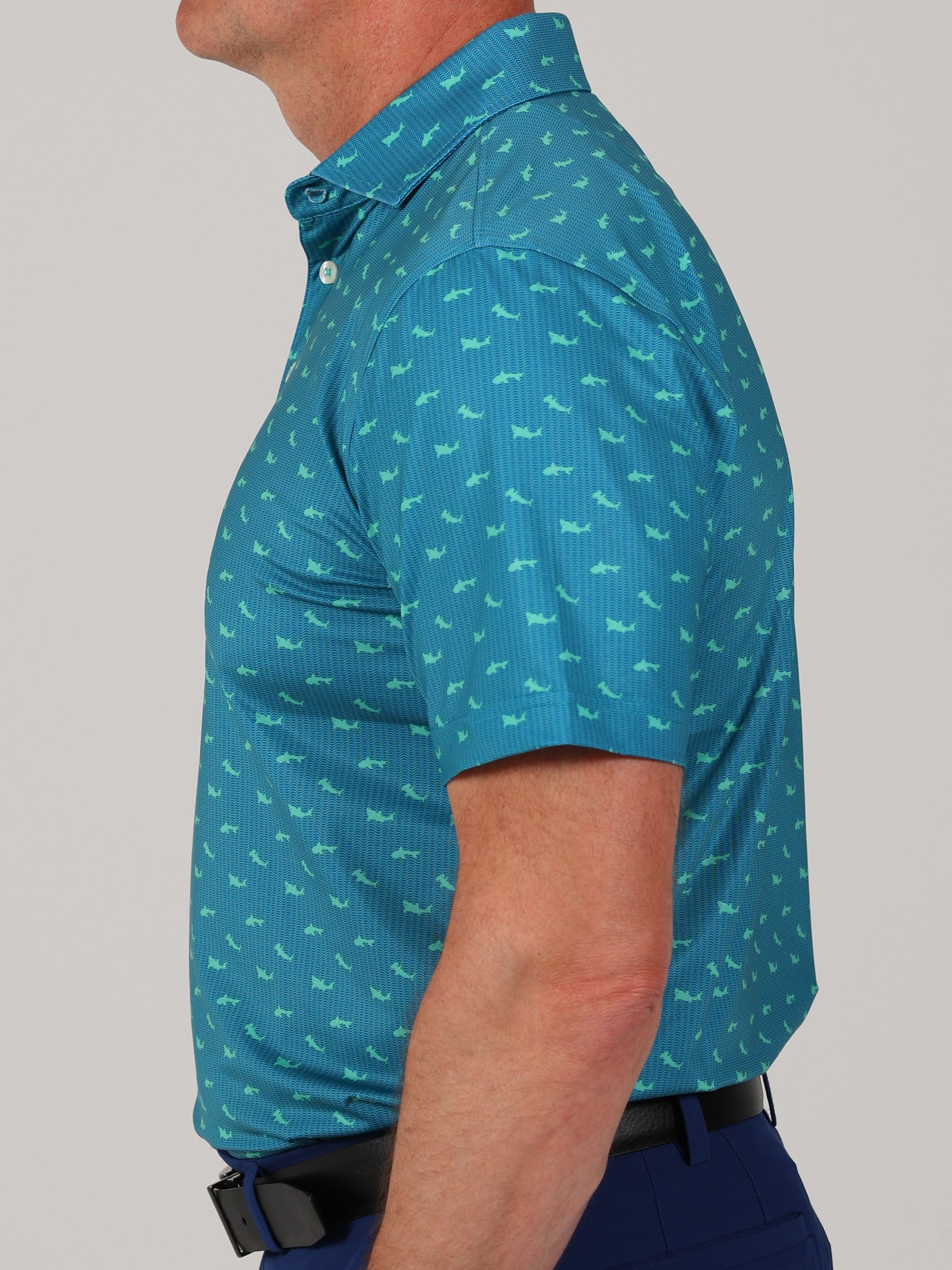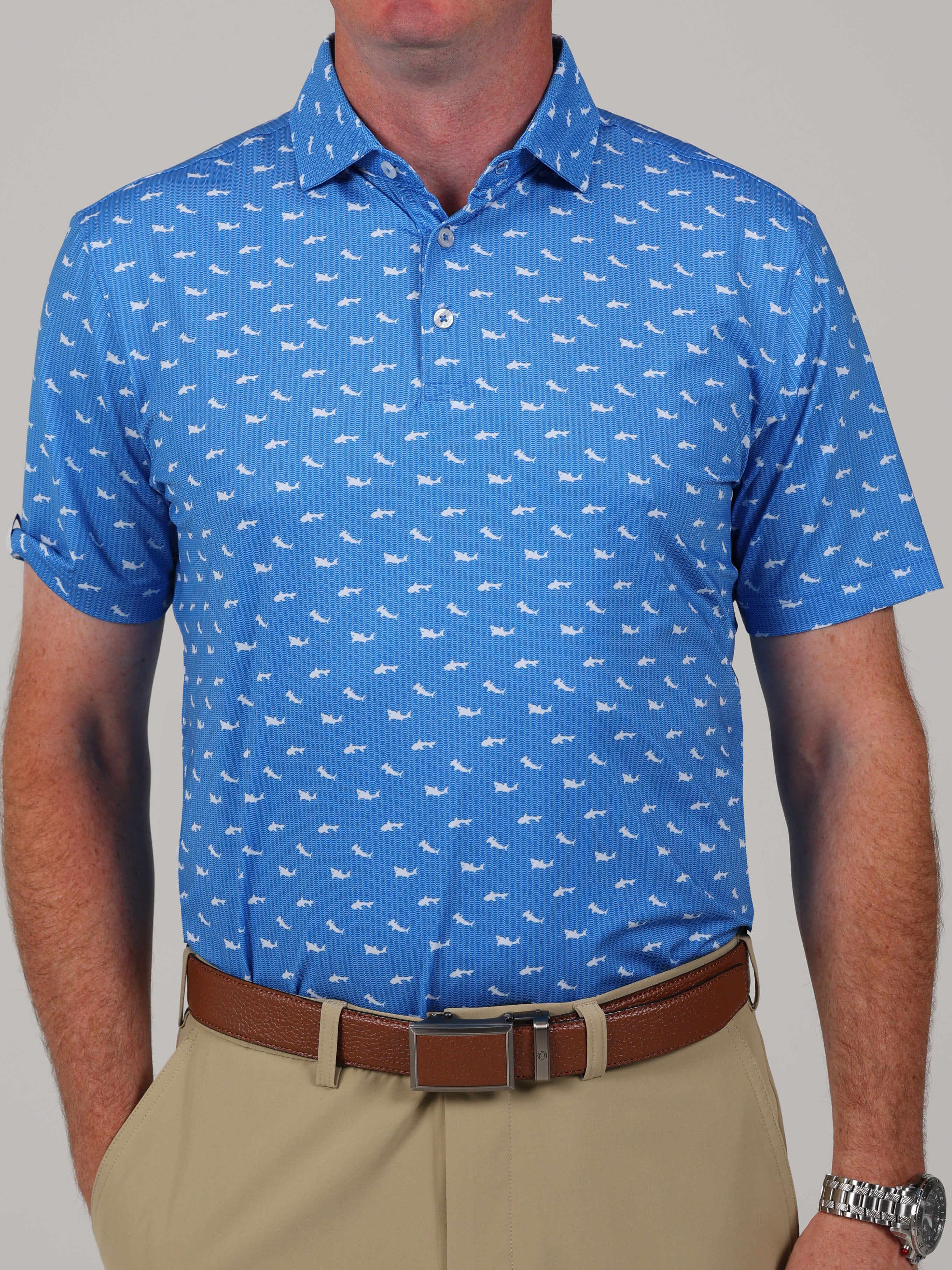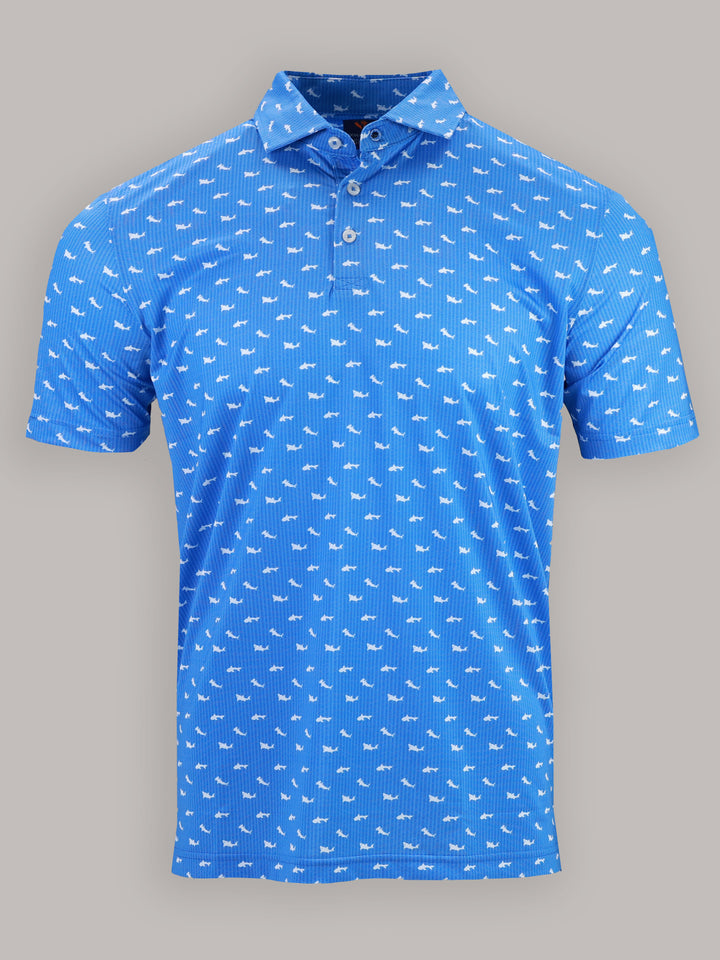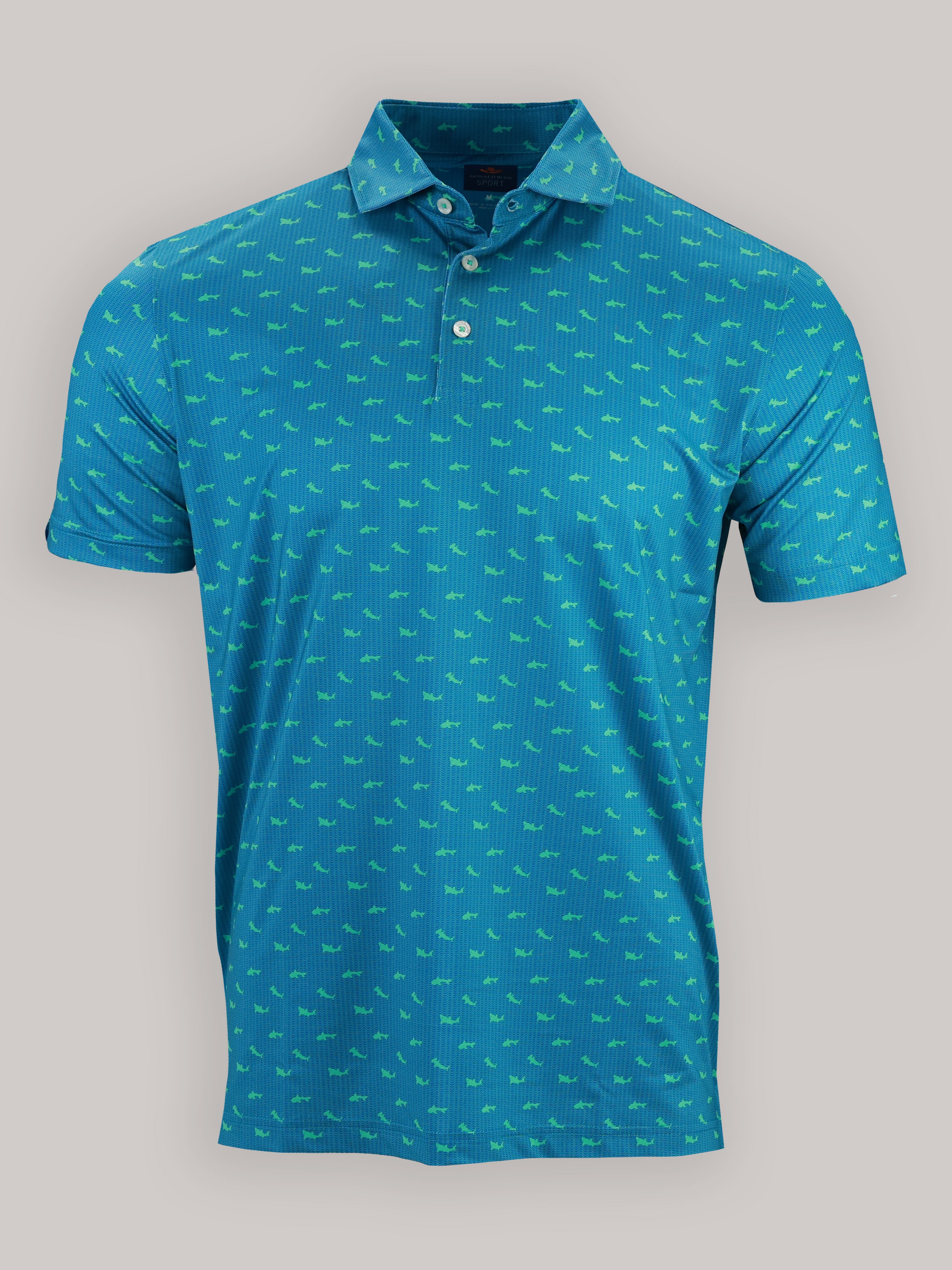 Description : Stay cool, sharp, and course-ready with the Callan Performance Jersey Golf Polo. Engineered for performance and elevated style, this men’s golf polo features a shark print and is crafted from a premium 91% polyester / 9% spandex blend for lightweight comfort and durability. Built with four-way stretch fabric, this polo moves with you—whether you're swinging on the course or heading into the clubhouse. The performance jersey knit offers exceptional breathability, moisture management, and a smooth hand feel, while UPF 50 sun protection keeps you shielded during long days outdoors. Designed with a classic three-button placket and a sophisticated spread collar, this polo brings a polished yet sporty look to your golf wardrobe. Backed by lifelong satisfaction, it's a piece you'll reach for round after round.