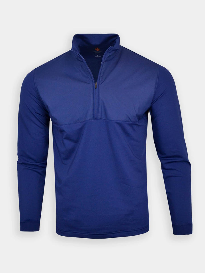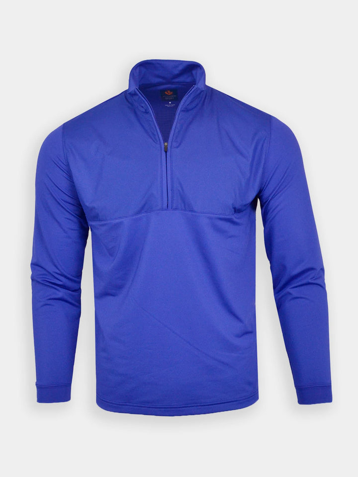 The Cameron, Men's 1/2 Zip Mid-Weight Pullover by Donald Ross Sportswear. A classic outerwear piece offered in three flattering color ways that add a subtle pop of color to any outfit. Constructed from our performance outerwear fabric, this garment feels cool to the touch and stays dry with moisture-wicking fabric. The Cameron offers full stretch and breathability for endless comfort on and off the course.