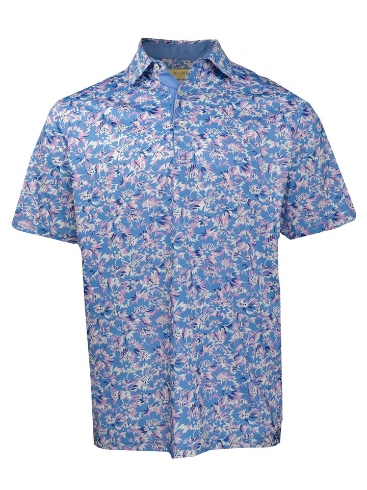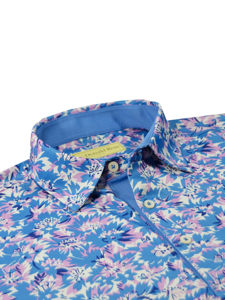 Make a statement in this colorful camo floral print! Offered in three vibrant summer color palettes. Constructed from our best selling technical performance yarn, this garment feels cool to the touch and stays dry as it wicks moisture away from your body. Model features classic three-button placket and self collar.