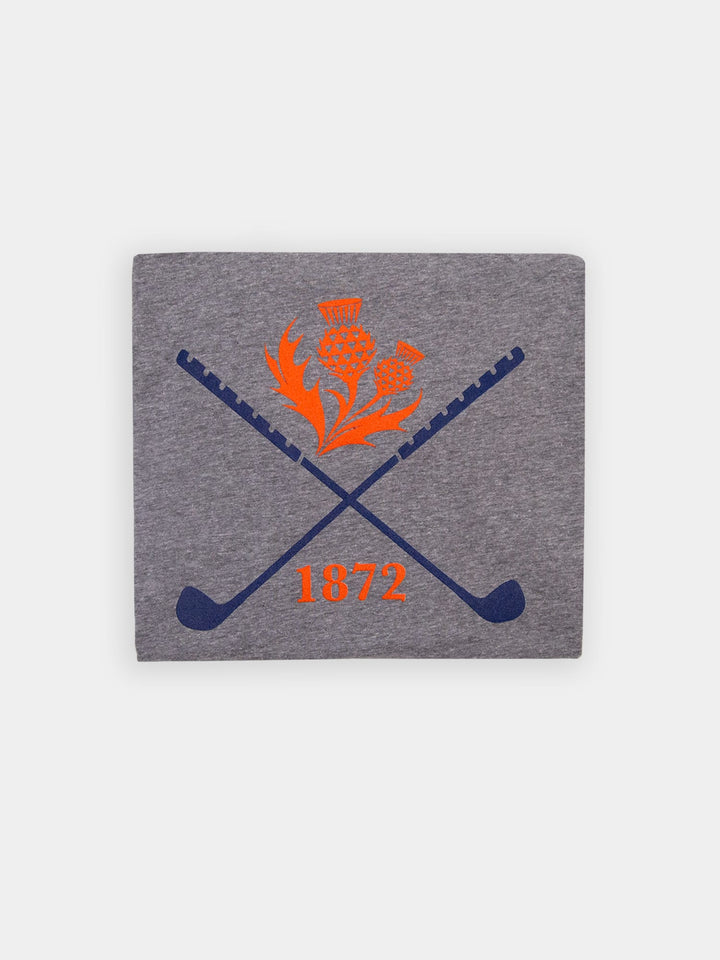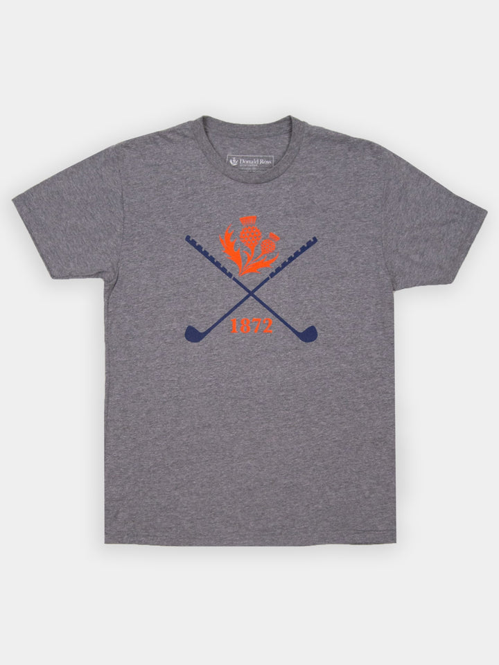 The Donald Ross Crossing Clubs II Sport Tee is built from ultra comfortable tri blend fabric. Features signature Thistle logo in between two crossing clubs and the year "1872" below both prominently featured in our Donald Ross Sport Orange.