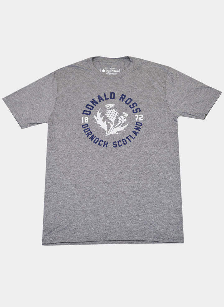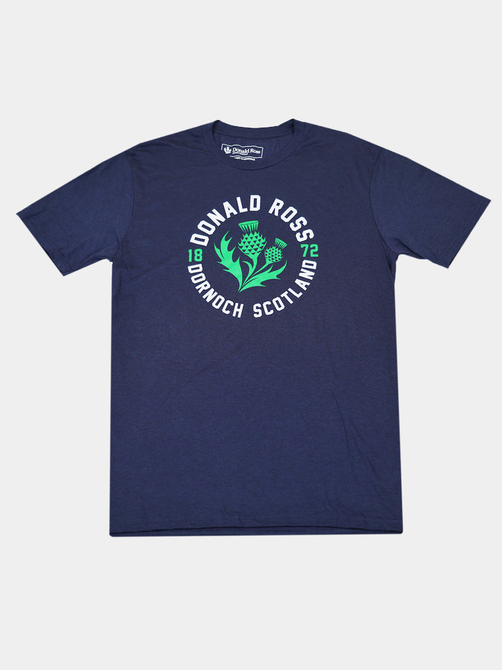 Inspired by legendary golf course architect Donald Ross, this tee highlights his Scottish heritage. The design features the Thistle, Scotland’s national flower, along with “Dornoch, Scotland” printed proudly on the front. Together, these elements create a bold statement that celebrates tradition in a relaxed style.
