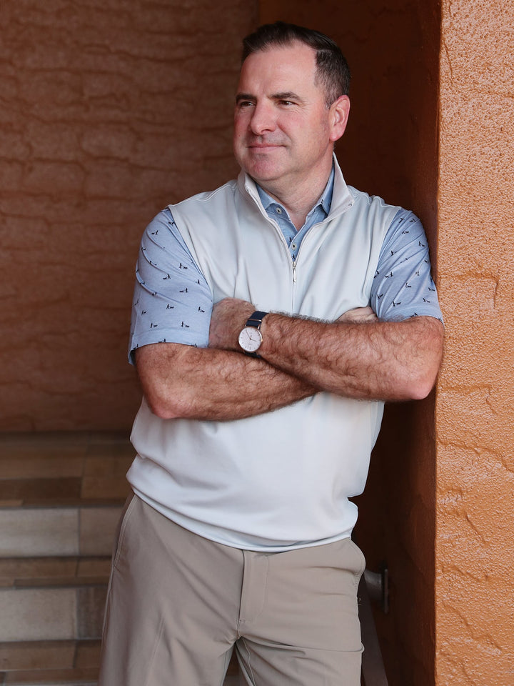 The Falkirk, Men's Half Zip Vest by Donald Ross Sportswear. A staple outerwear piece offered in six lasting color ways. Constructed from our performance fabric, this garment feels cool to the touch and also remains dry with moisture wicking fabric. The Falkirk Vest offers full stretch and breathability for unquestionable comfort on and off the course.