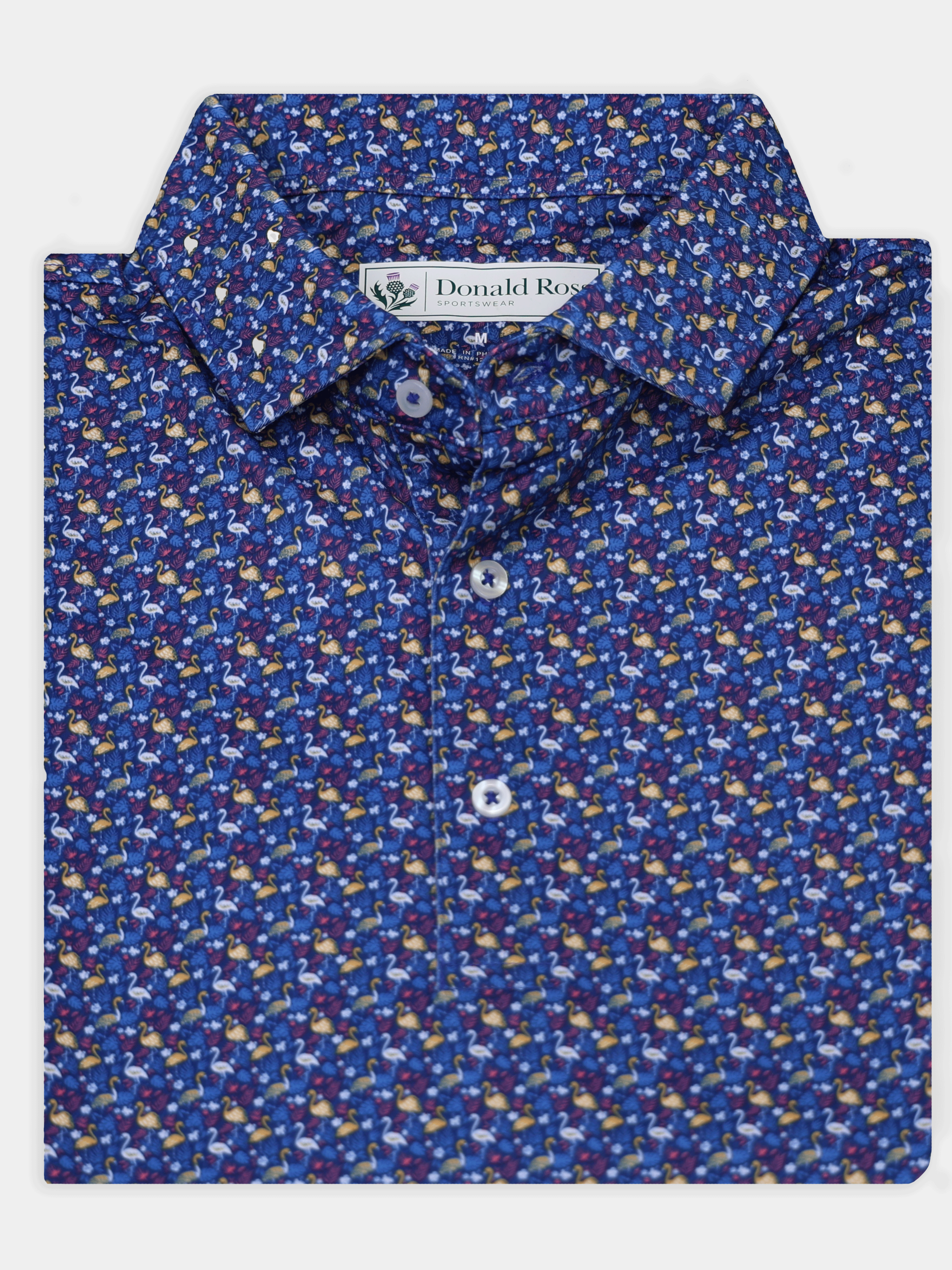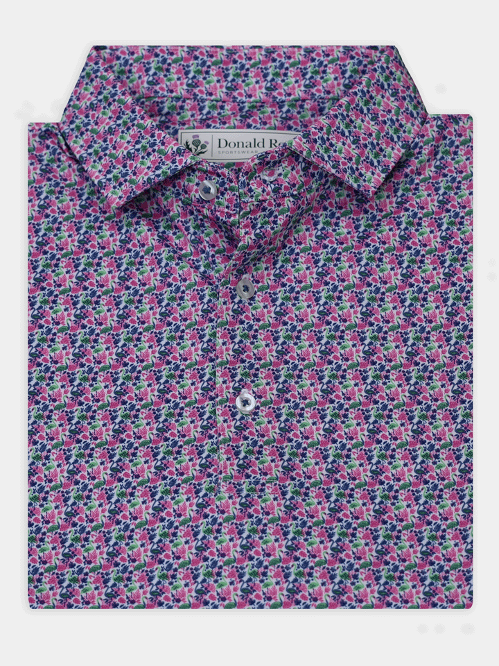 Elevate your golf game with the Classic Fit Frankie Flamingo Print Golf Polo, designed for all-day comfort, timeless style, and performance on and off the course. Crafted from a premium 91% polyester / 9% spandex blend in a breathable performance jersey knit, this short-sleeve golf polo offers lightweight stretch and moisture-wicking comfort for every swing. Finished with a three-button placket, spread collar, and UPF 50+ sun protection, this flamingo print golf shirt blends style and function with ease. Whether you're teeing off, heading to the clubhouse, or simply enjoying a casual weekend, this men’s performance golf polo delivers lifelong satisfaction in every wear.