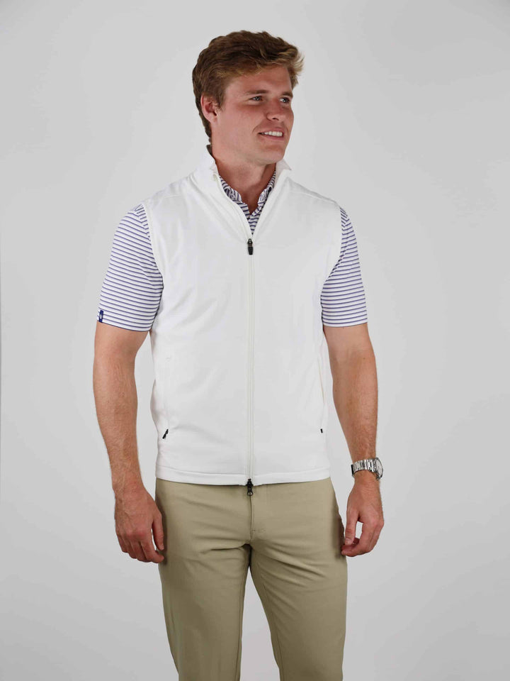 The Tristan, a full zip performance vest by Donald Ross Sportswear is a performance outerwear piece. Our classic full zip vest is available in four unique colors.