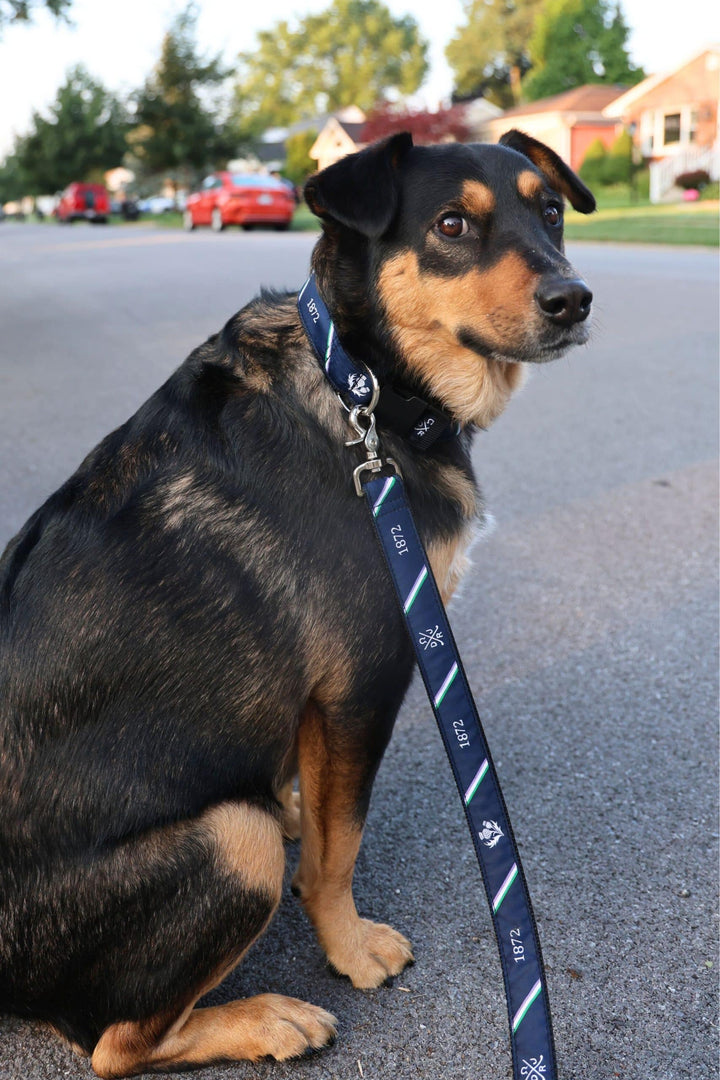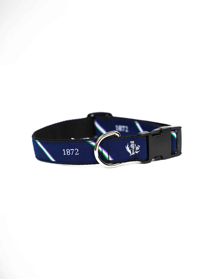 The Donald Ross Heritage Dog Collar features the DJR monogram, thistle, and Donald Ross’s birth year, 1872. Designed with brand colors—blue, purple, and green—it’s a stylish accessory for your pup.