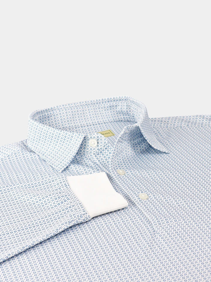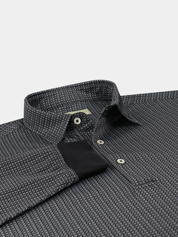 Worn under a vest, sweater, or sport coat, our Long Sleeve Neat Geo Print Jersey features a two-color geometric collage that is a sharp and lively addition to any outfit. Constructed from a lightweight four-way stretch performance yarn that allows comfortable breathable warmth in brisk temperatures. This garment feels cool to the touch and stays dry as it wicks moisture away from your body. Model features a classic three-button placket, self-collar, and long sleeves with self-banded sleeve cuffs.