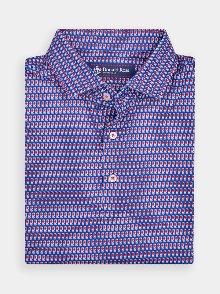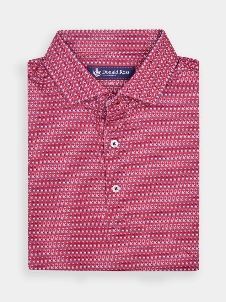 The Moreland, Men's DJR Print Polo by Donald Ross Sportswear. The Moreland features a DJR beer can print polo offered in Navy and Red colorways. Constructed from our performance jersey fabric, this garment also feels cool to the touch and stays dry with moisture-wicking fabric. The Moreland offers full stretch and breathability for overall comfort on and off the course.