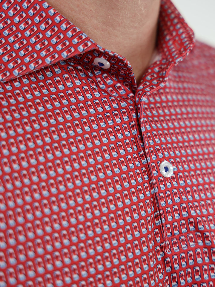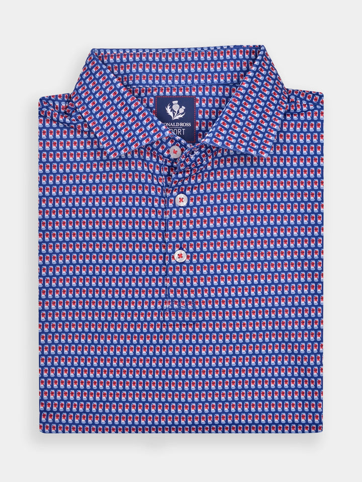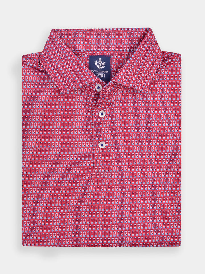 The Garfield, Men's DJR Print Polo by Donald Ross Sportswear. The Garfield features a DJR beer can print polo offered in Navy and Red colorways. Constructed from our performance jersey fabric, this garment also feels cool to the touch and stays dry with moisture-wicking fabric. The Garfield offers full stretch and breathability for overall comfort on and off the course.