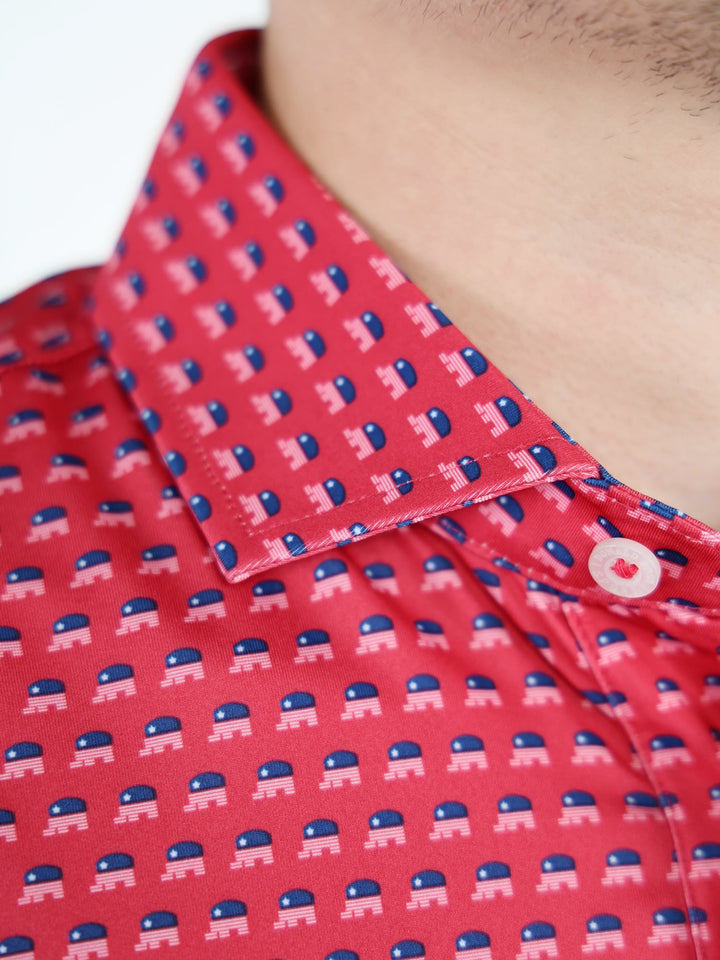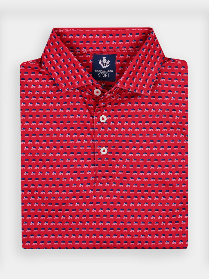 The Elliot, Men's Elephant Performance Polo by Donald Ross Sportswear. Featuring the signature Republican Party elephant symbol in our performance jersey fabric. This garment feels cool to the touch and also keeps dry with moisture-wicking fabric. Performance shirts offers full stretch and breathability for any off course activities.