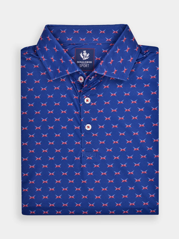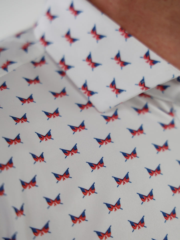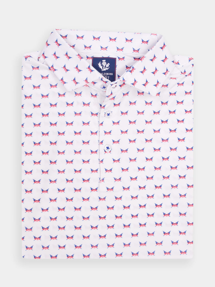 The Grant, Men's Flag Print Polo by Donald Ross Sportswear. The Grant features a crossing American flag polo offered in both Navy and White colorways. Constructed from our performance jersey fabric, this garment also feels cool to the touch and stays dry with moisture-wicking fabric. The Grant offers full stretch and breathability for overall comfort on and off the course.