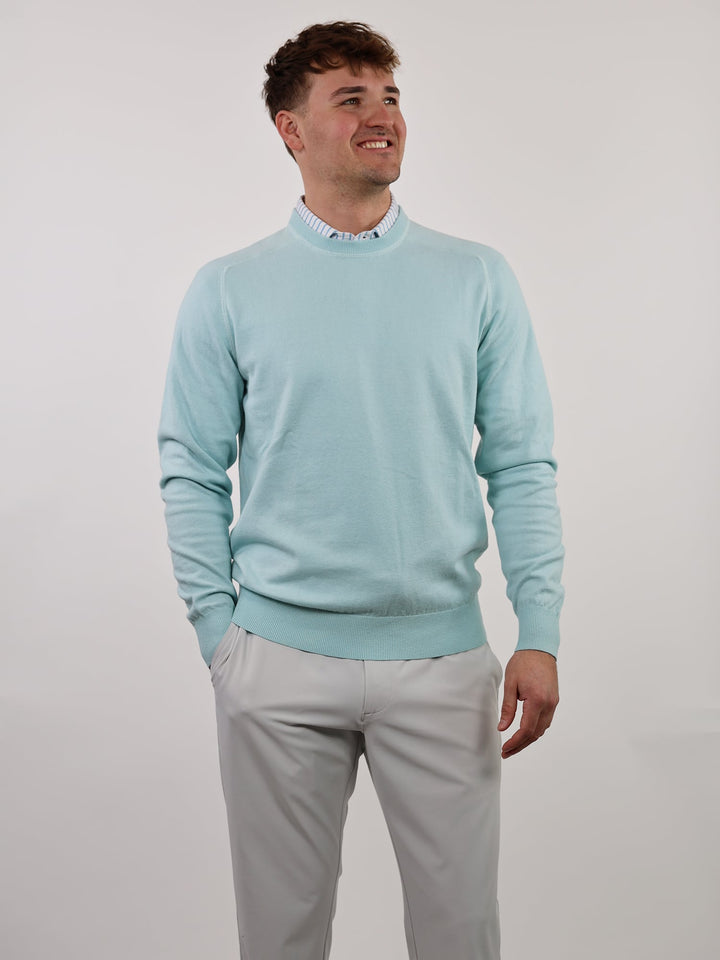 The Men's Solid Crewneck Sweater by Donald Ross Sportswear. A staple outerwear piece offered in nine solid colors that correspond with our Spring 2024 collection, perfect for pairing over your favorite polo.