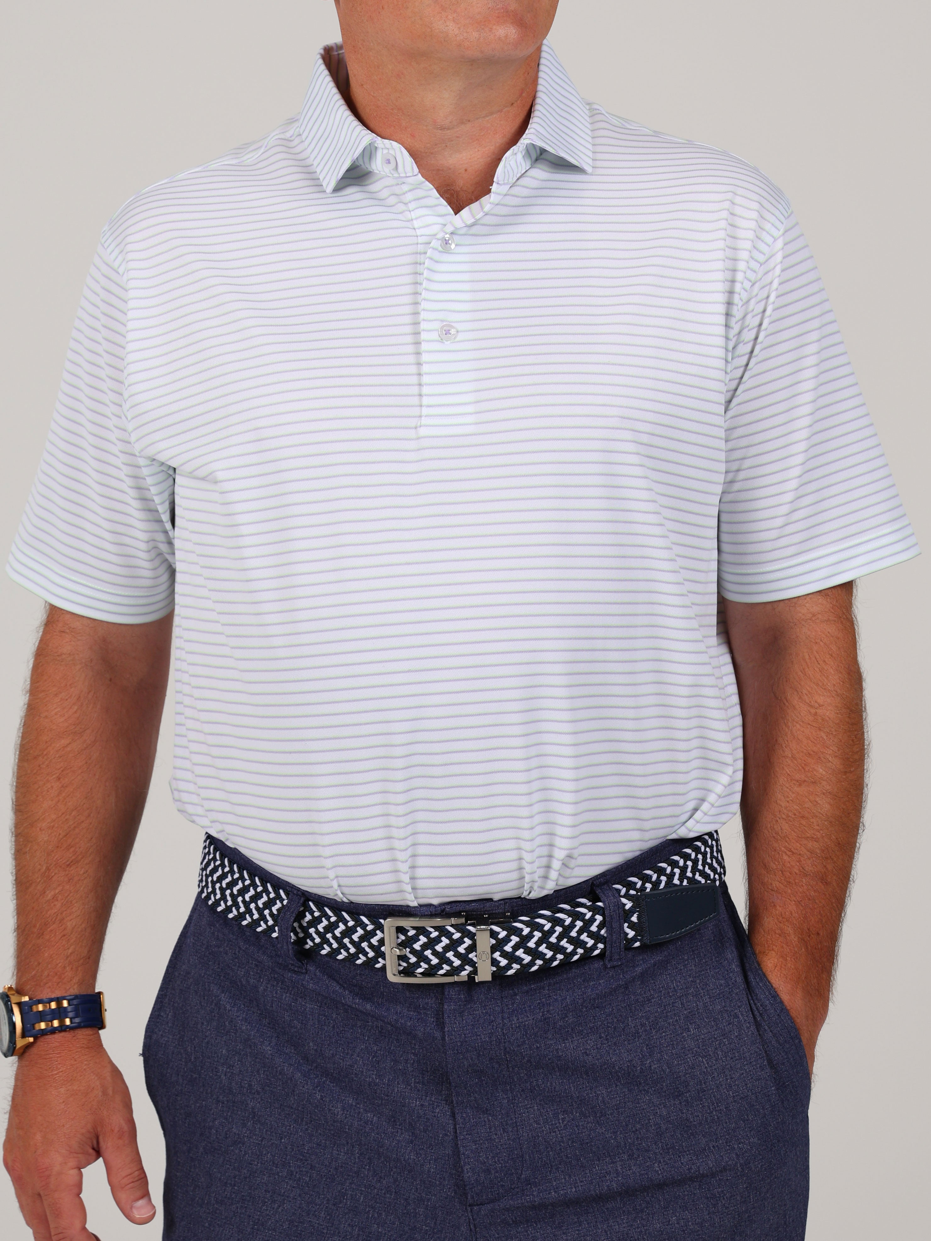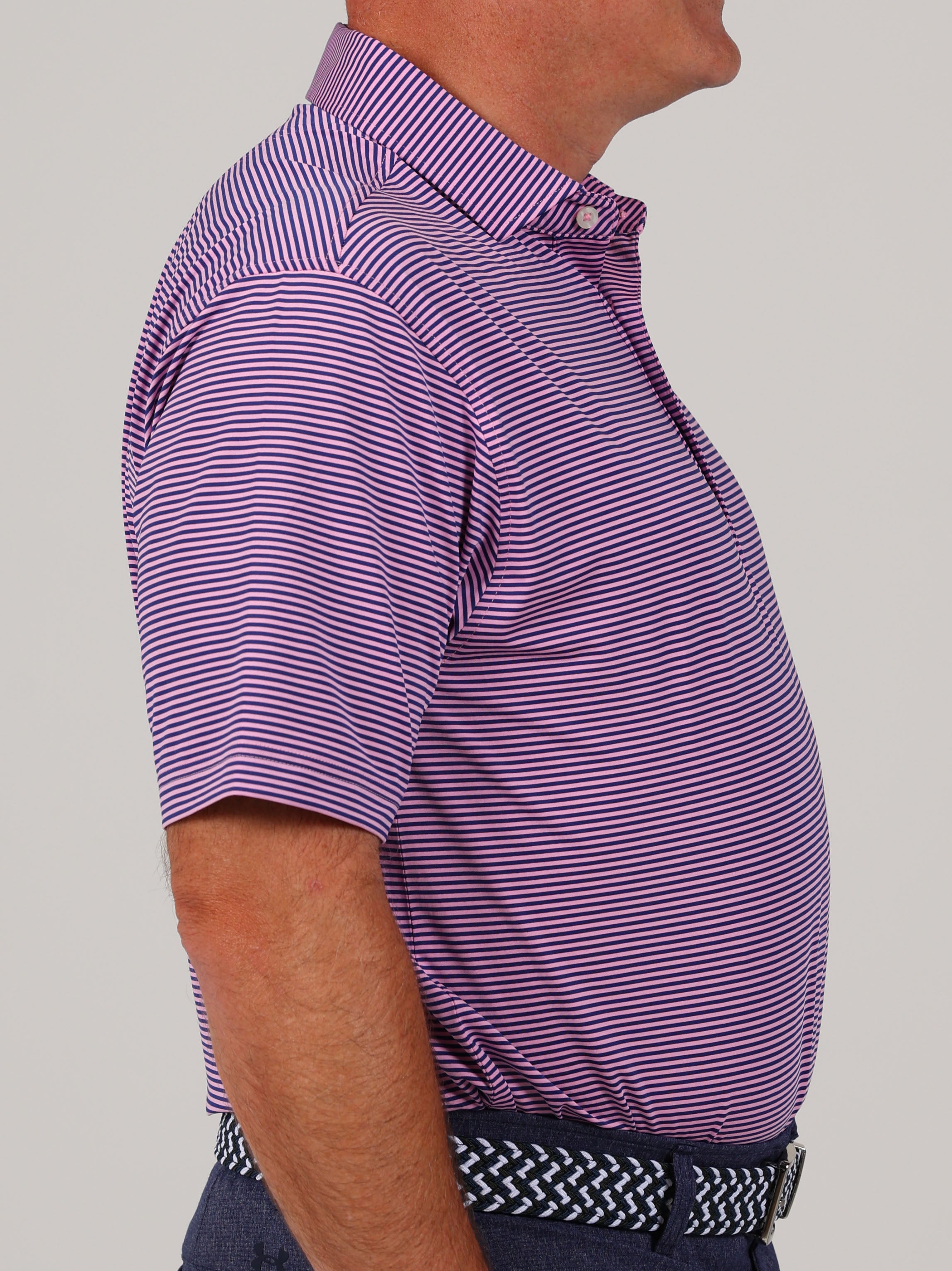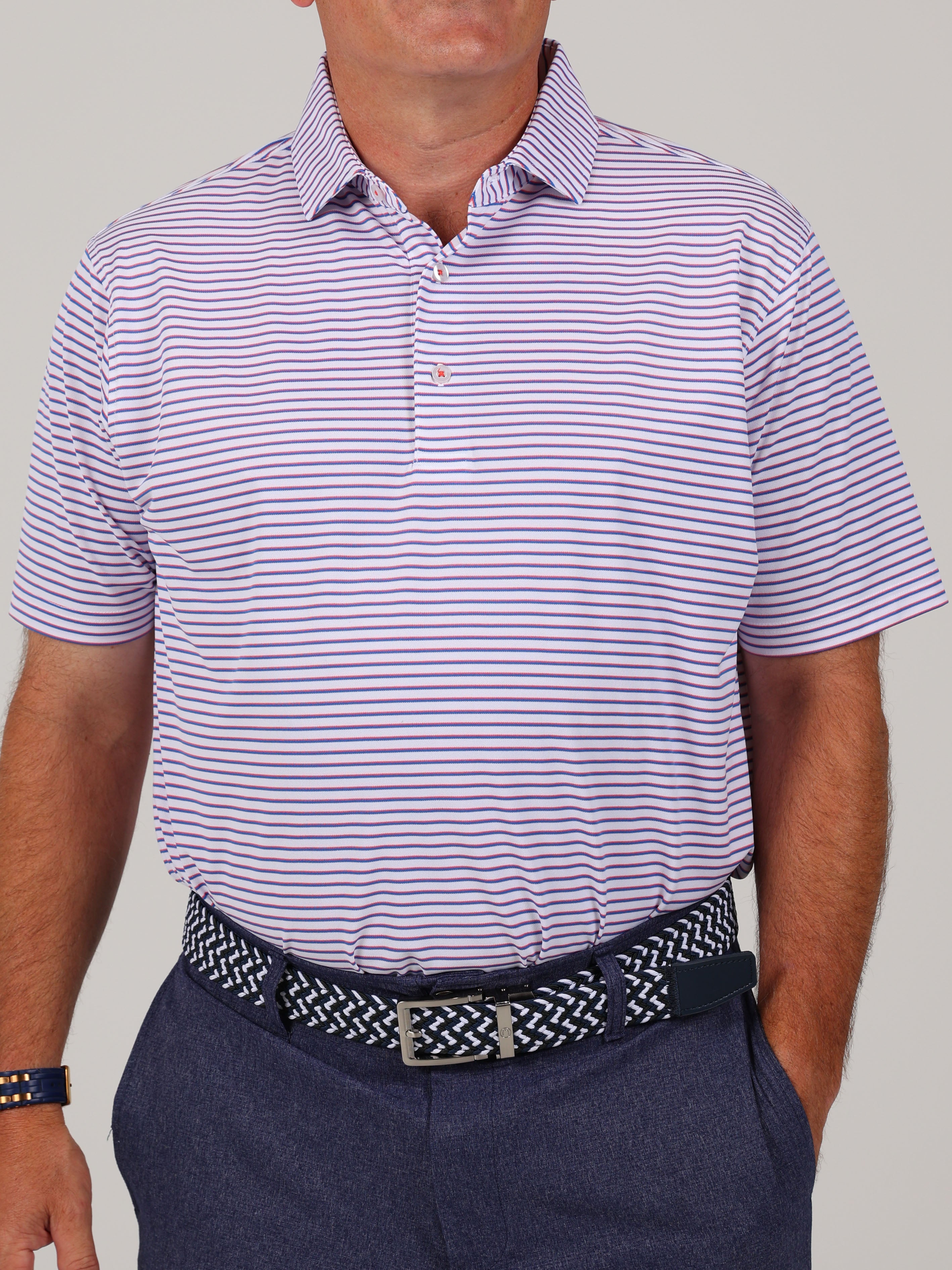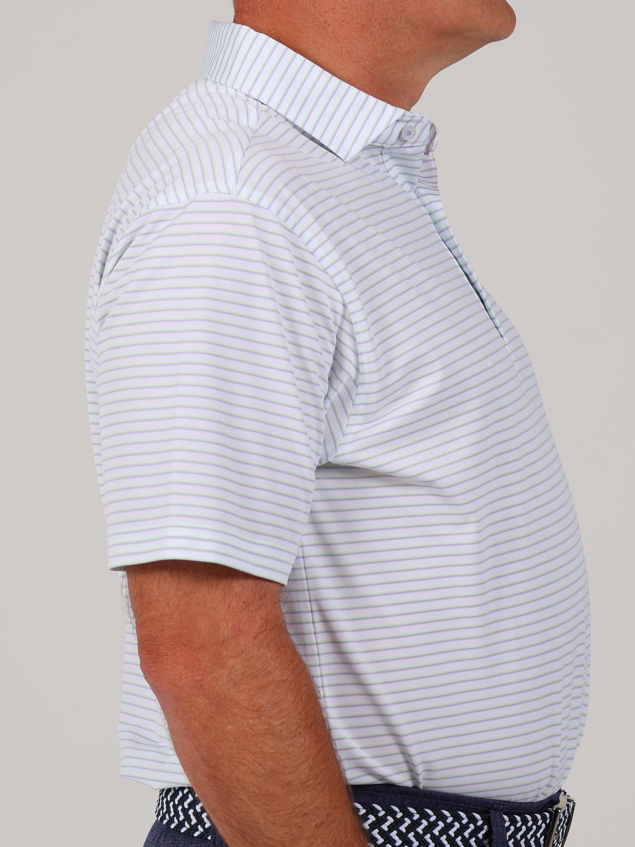 Description : Elevate your golf game with the Classic Fit Monroe Golf Polo, designed for all-day comfort, timeless style, and performance on and off the course. Crafted from a premium 91% polyester / 9% spandex blend in a breathable baby pique knit, this short-sleeve golf polo offers lightweight stretch and moisture-wicking comfort for every swing. The Classic Fit features a relaxed cut with extra room in the sleeves and torso, making it perfect for golfers who prefer a more traditional silhouette with enhanced mobility and longer coverage. Finished with a three-button placket, a finely detailed collar, and UPF 50+ sun protection, this multi stripe golf shirt blends style and function with ease. Whether you're teeing off, heading to the clubhouse, or simply enjoying a casual weekend, this men’s performance golf polo delivers lifelong satisfaction in every wear.