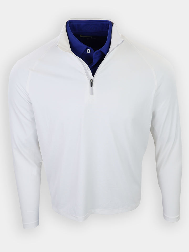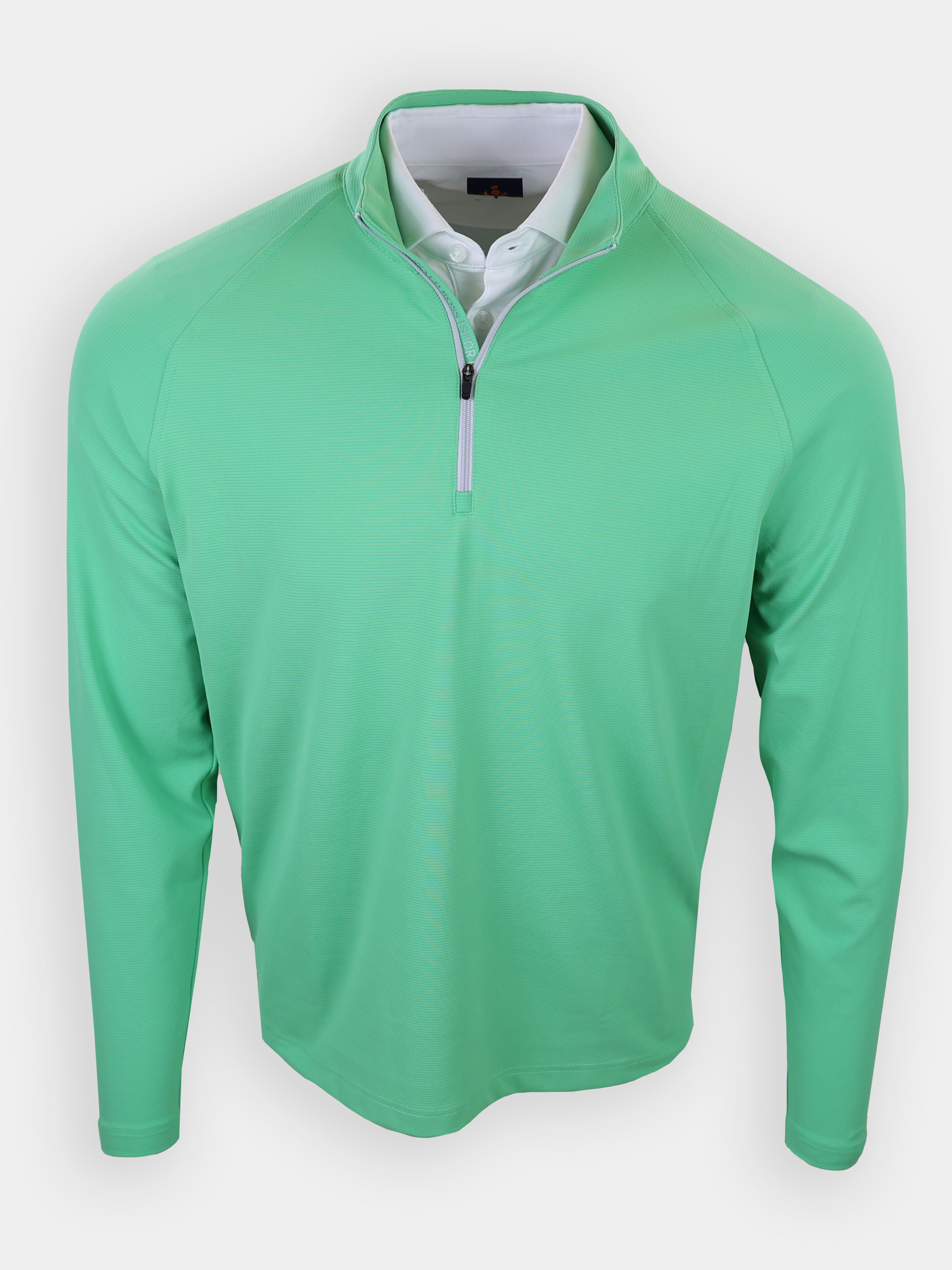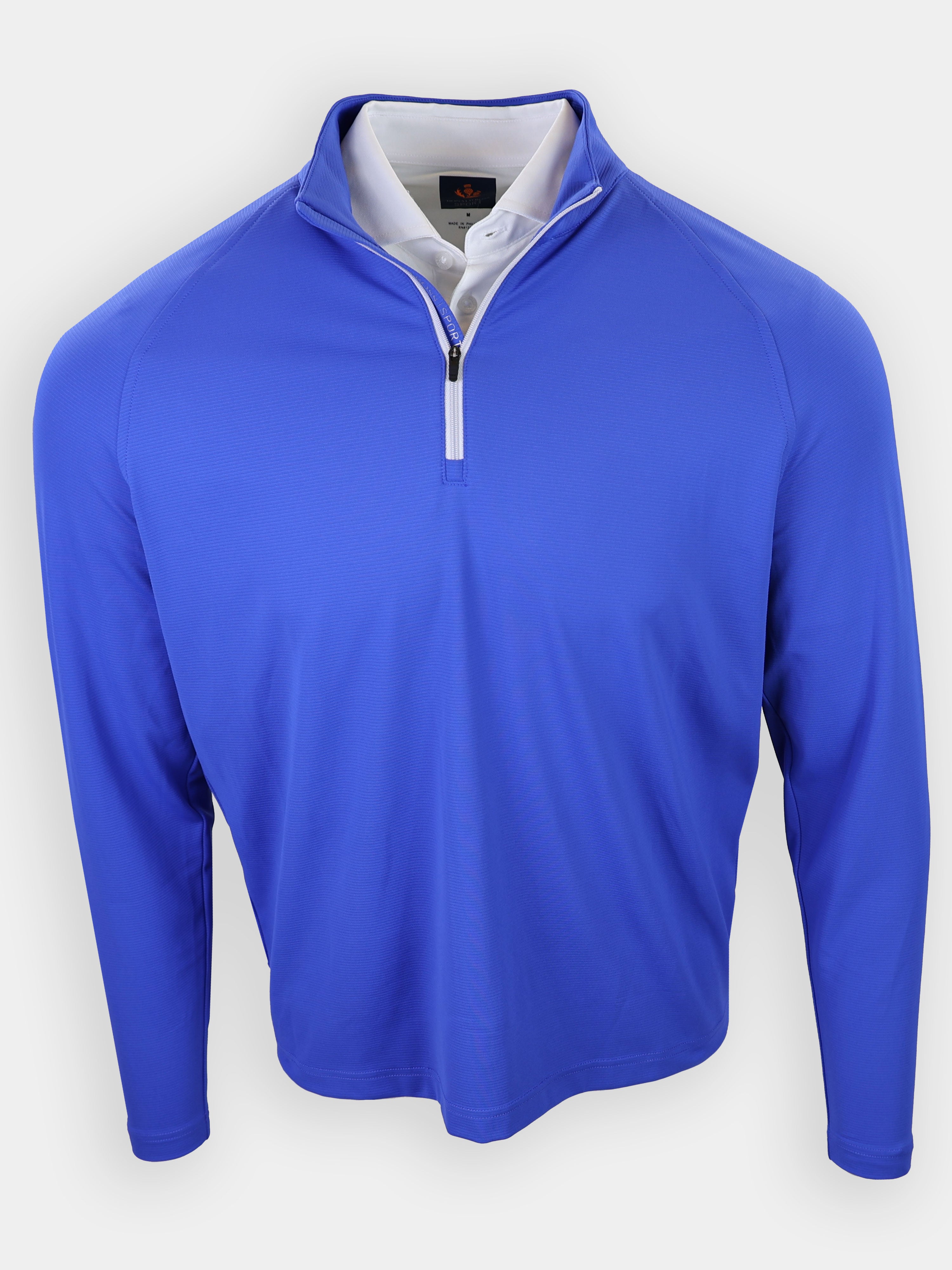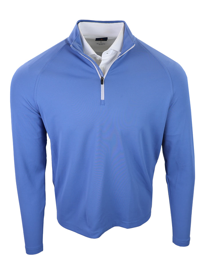 Made from a polyester/spandex blend, it’s light and easy to care for. The Niall Pullover is great for layering and pairs nicely with a golf shirt. It has an exposed center front zipper, grey zipper teeth and tape, Ottoman ribbed texture and a rubber thistle logo on the back collar. This quarter zip adds style and comfort.