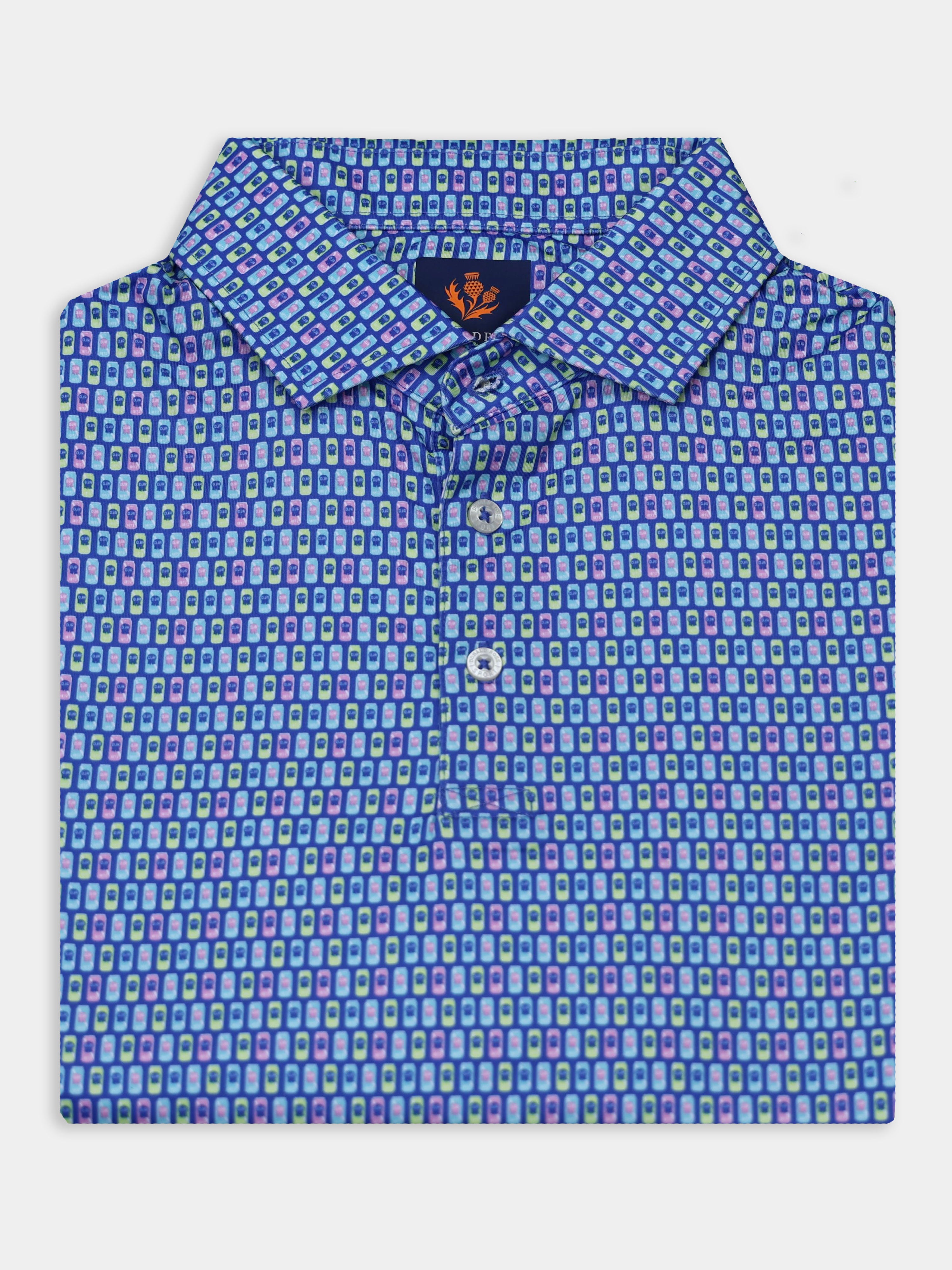 The Norm Beer Can Print Polo by Donald Ross Sportswear stands out with its bold design. Made from a performance jersey fabric, this polo keeps you cool and dry with its moisture-wicking properties.