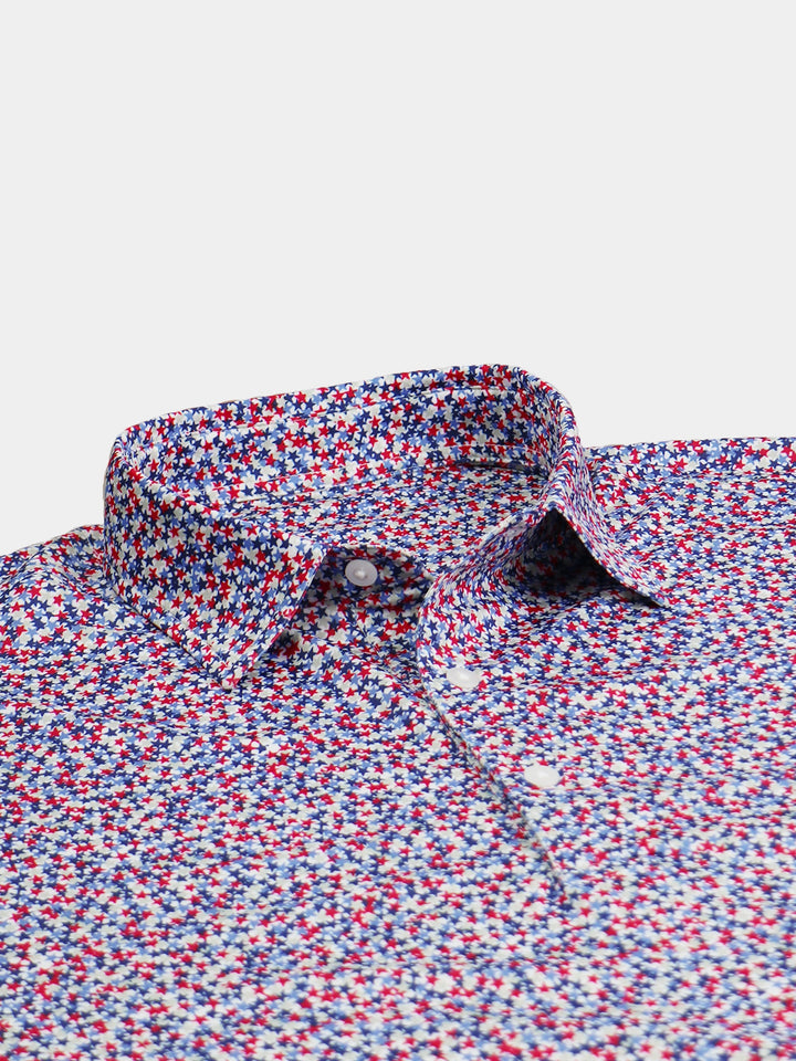 Star-spangled with red, white, and blue our confetti star print jersey shines with patriotic pride. Constructed from our best-selling technical performance yarn, this garment feels cool to the touch and stays dry as it wicks moisture away from your body. Model features a classic three-button placket and self-collar.