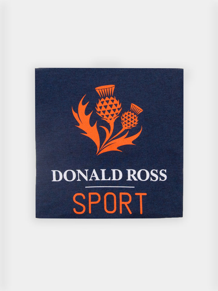 The DJR Sport Performance Tee is an ultra comfortable tri blend fabric. Features signature Thistle logo in orange and "Donald Ross Sport" prominently shown below.