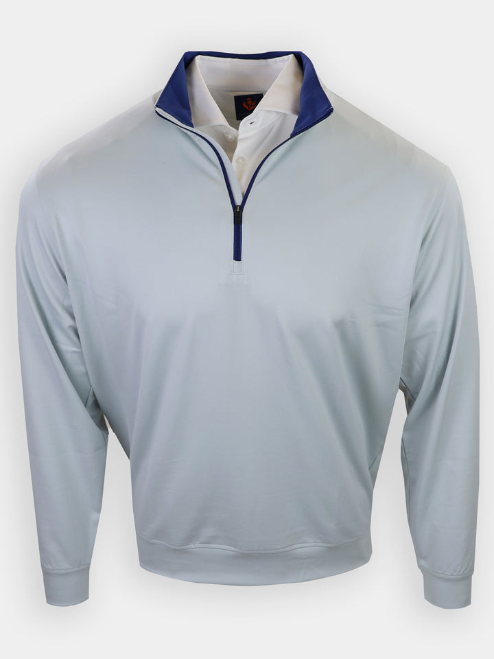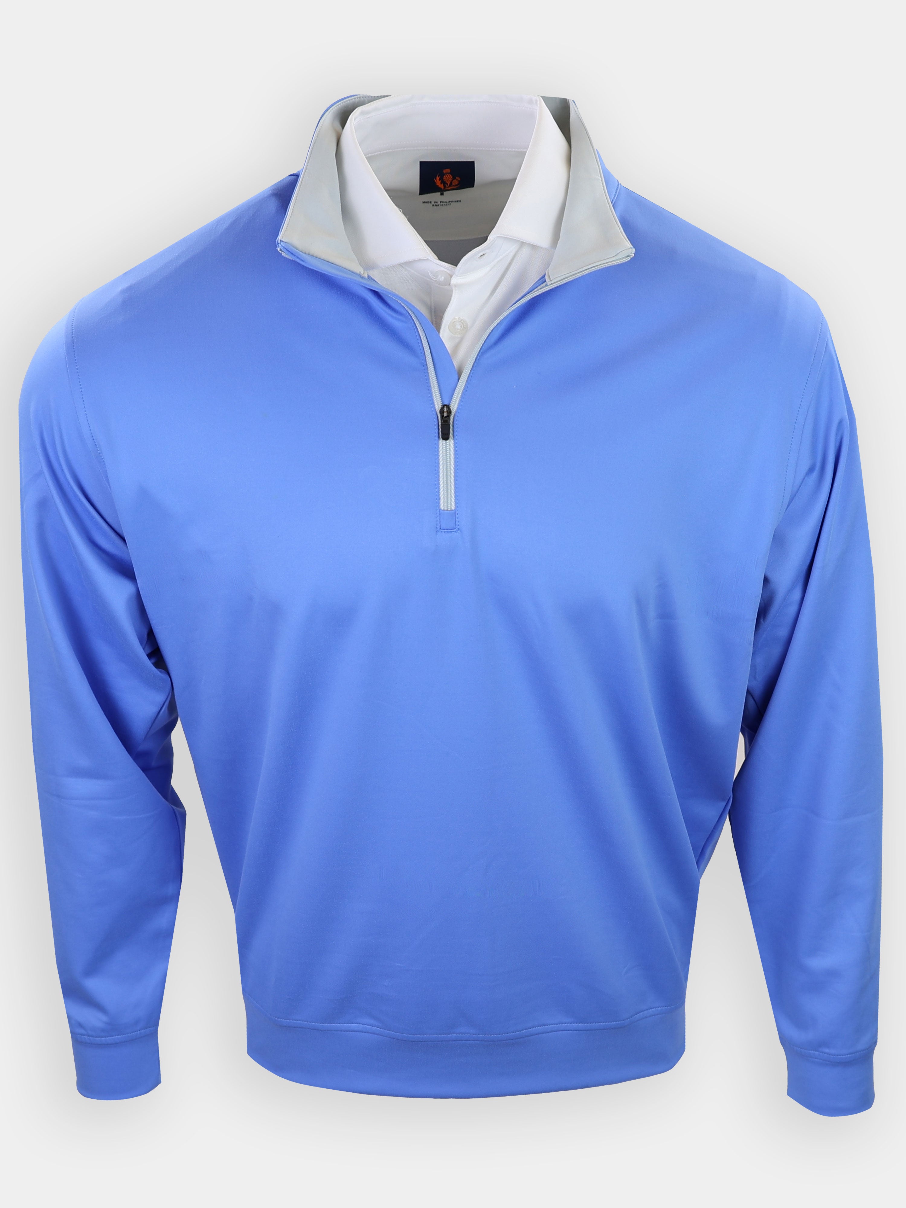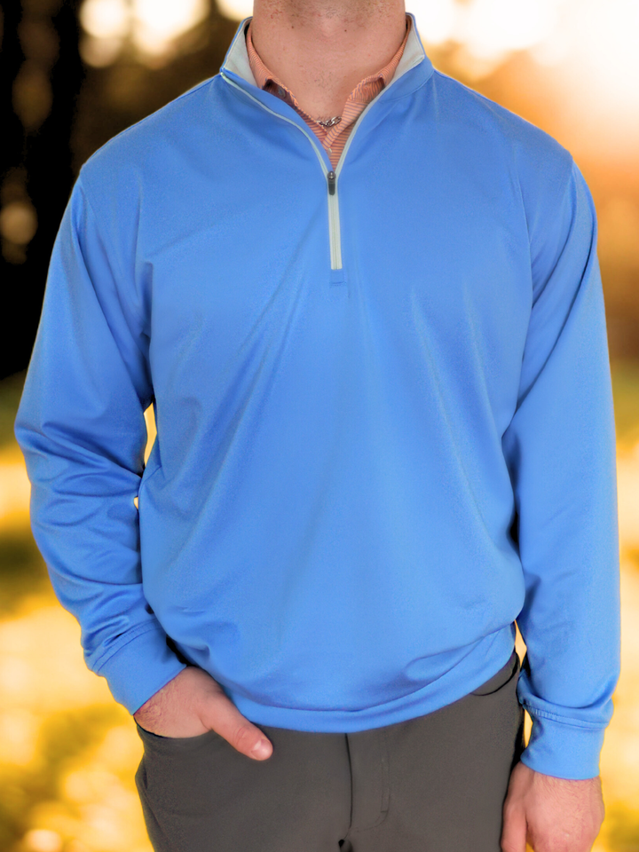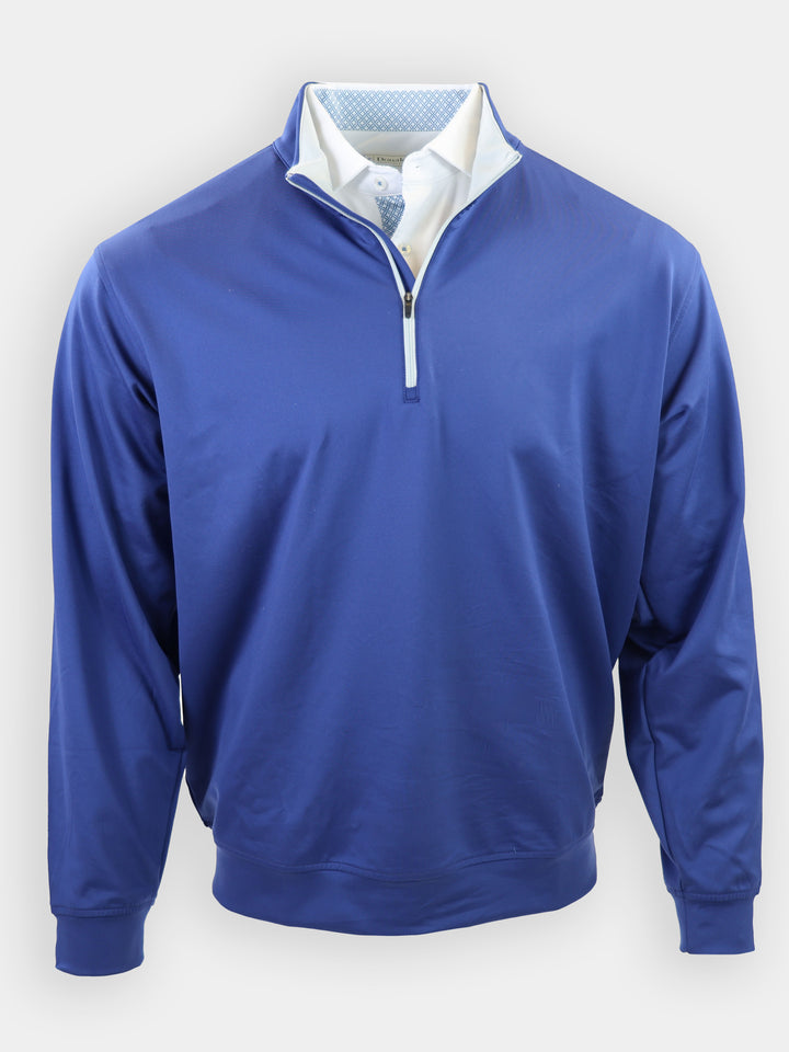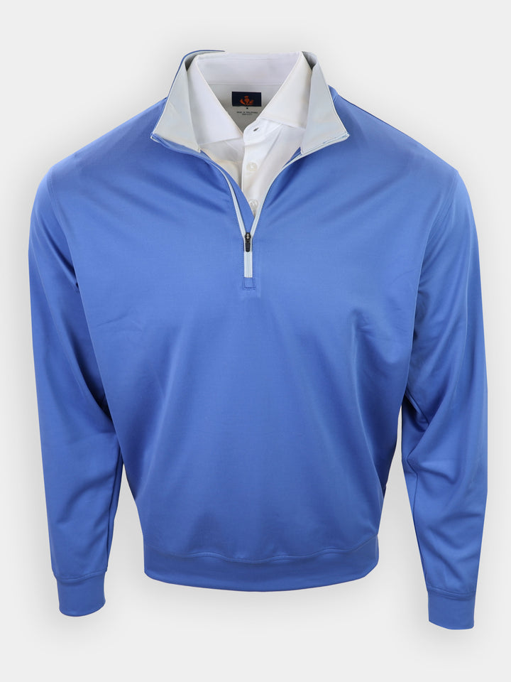 Designed for refined performance on the golf course and beyond, this mid-weight long sleeve 1/4 zip pullover is crafted from a premium polyester-spandex blend for breathable warmth and four-way stretch. An exposed center-front 9” zipper adds a modern edge, while set-in shoulders and banded cuffs and hem deliver a tailored, polished fit. Finished with a solid contrast interior collarband and a subtle rubber thistle logo at the back collar for an elevated, course-ready look.