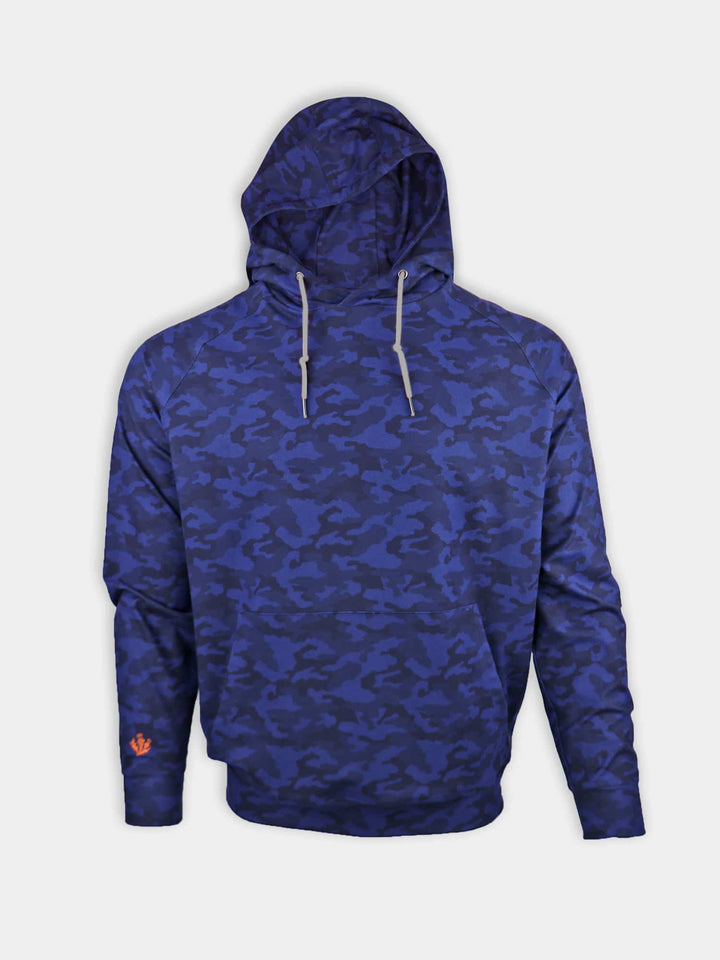TYLER. Long sleeve lightweight stretch fleece hoodie features a camo print offering four-way stretch, breathable warmth, and easy care properties. Model features grey sport accessories, kangaroo pocket, and self-banded cuffs and waistband.
